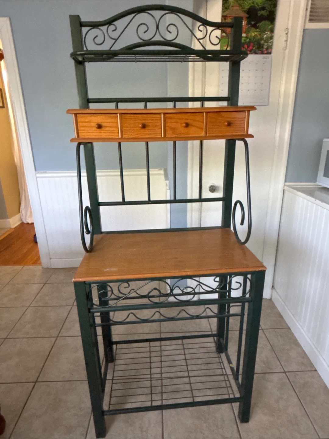 Selling a baker's rack with wood accents. It features a sturdy metal frame, wooden drawers, a wooden countertop, and a wine rack at the bottom. It's perfect for adding extra storage and style to your kitchen or dining area!