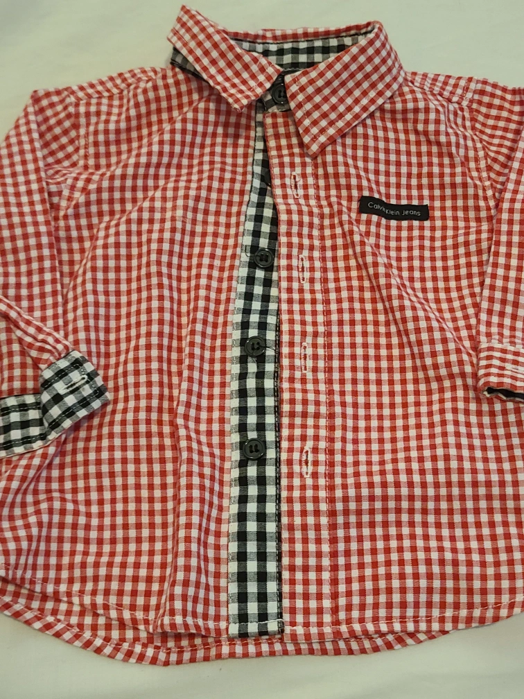 A cute Calvin Klein Jeans shirt for your little one! This long-sleeved shirt features a red and white checkered pattern with contrasting black and white checkered accents. Size is 6/9 months. From a pet-free, smoke-free home Porch pickup near Bathurst station