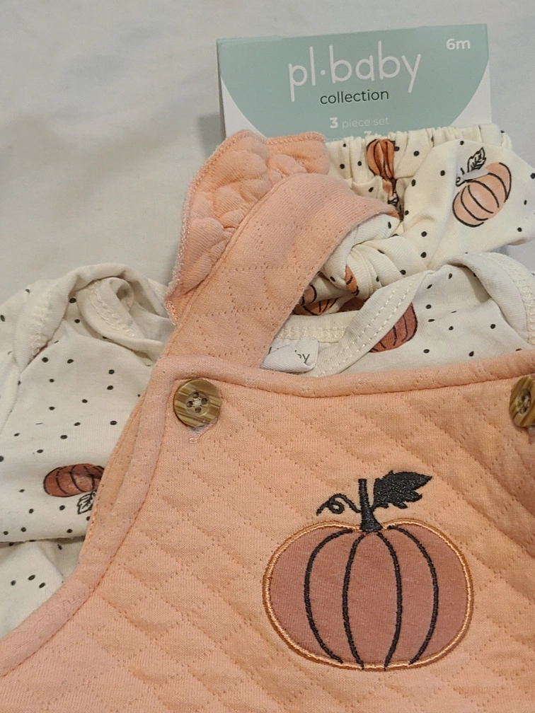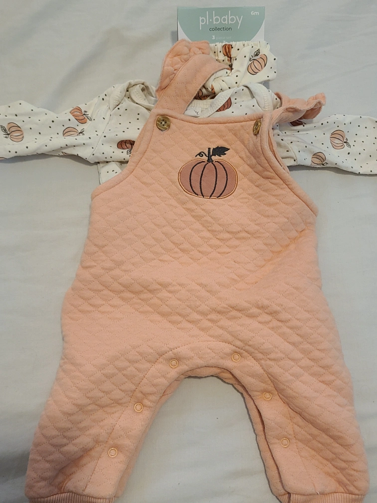Super cute pl.baby 3-piece set for your little one! This adorable outfit is in size 6m and features a sweet pumpkin design. It includes a bodysuit, overalls, and headband, perfect for autumn days From a pet-free, smoke-free home Porch pickup near Bathurst station