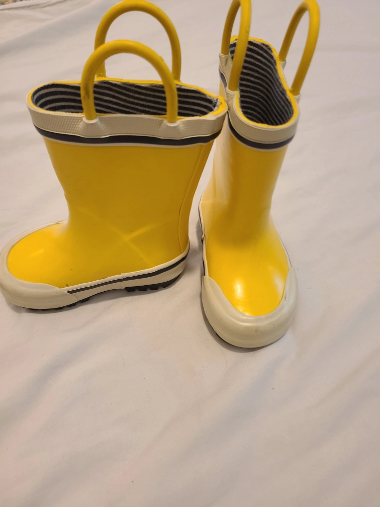 Here are a pair of bright yellow rain boots! They have handles to make it easier for your little one to put them on and take them off. Great for puddle jumping on rainy days! Size 4 From a pet-free, smoke-free home Porch pickup near Bathurst station
