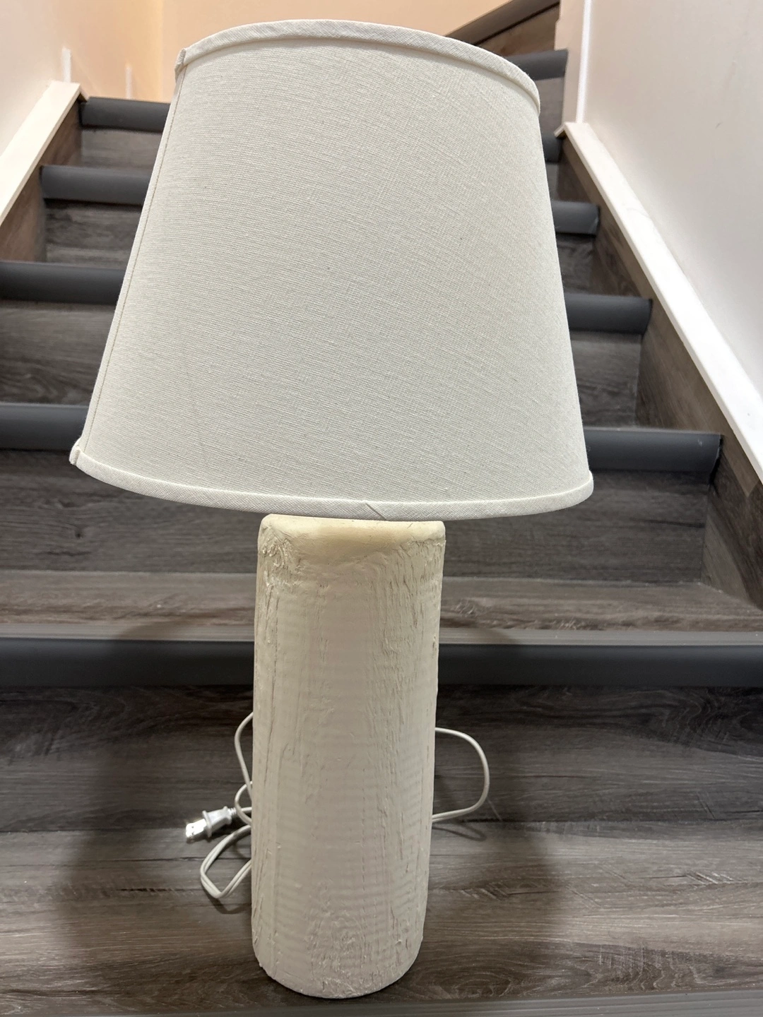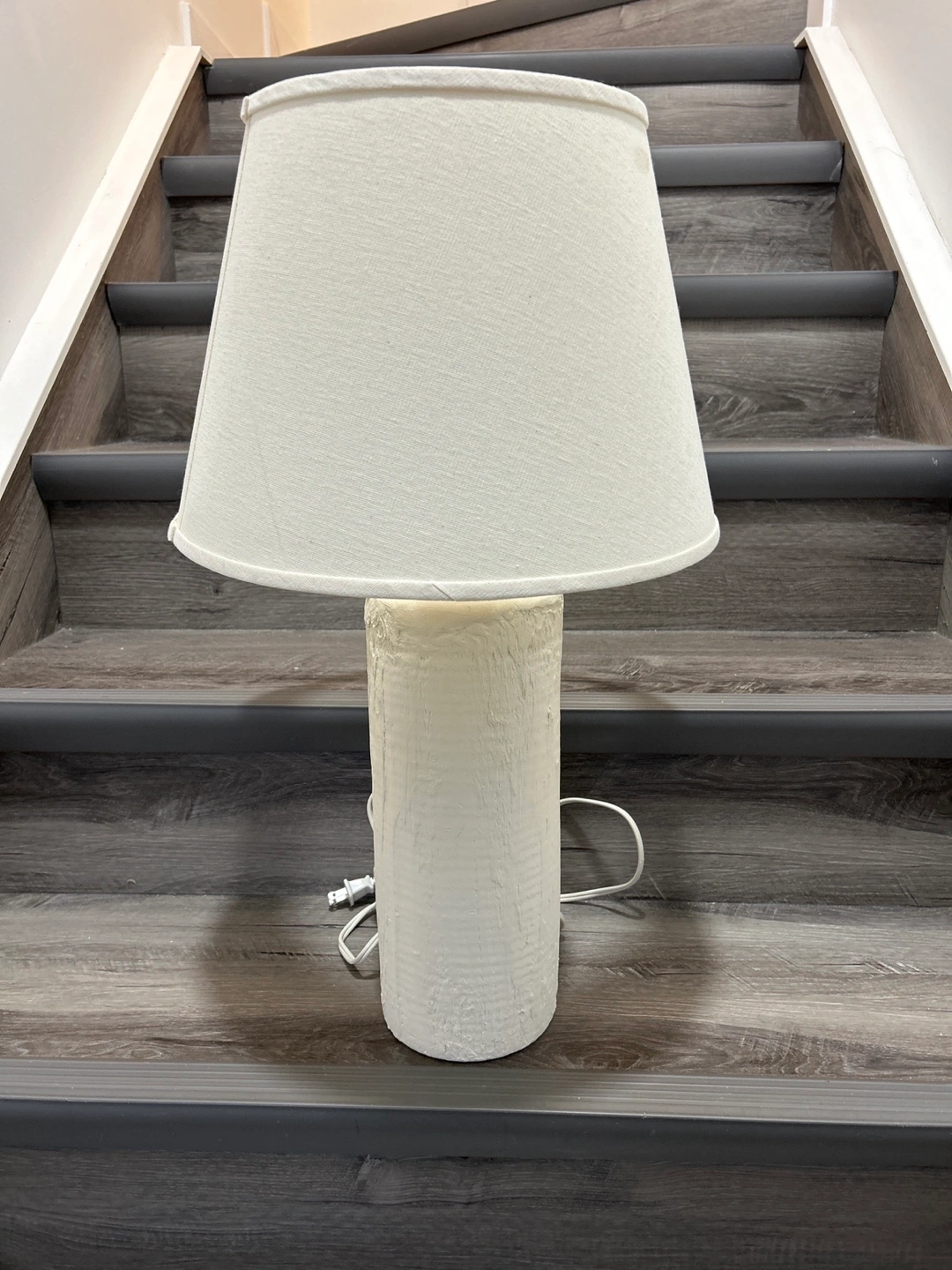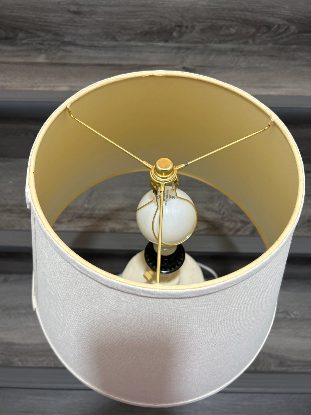 Selling a cute table lamp! It features a textured white base and a classic lampshade. It would look great in any room!