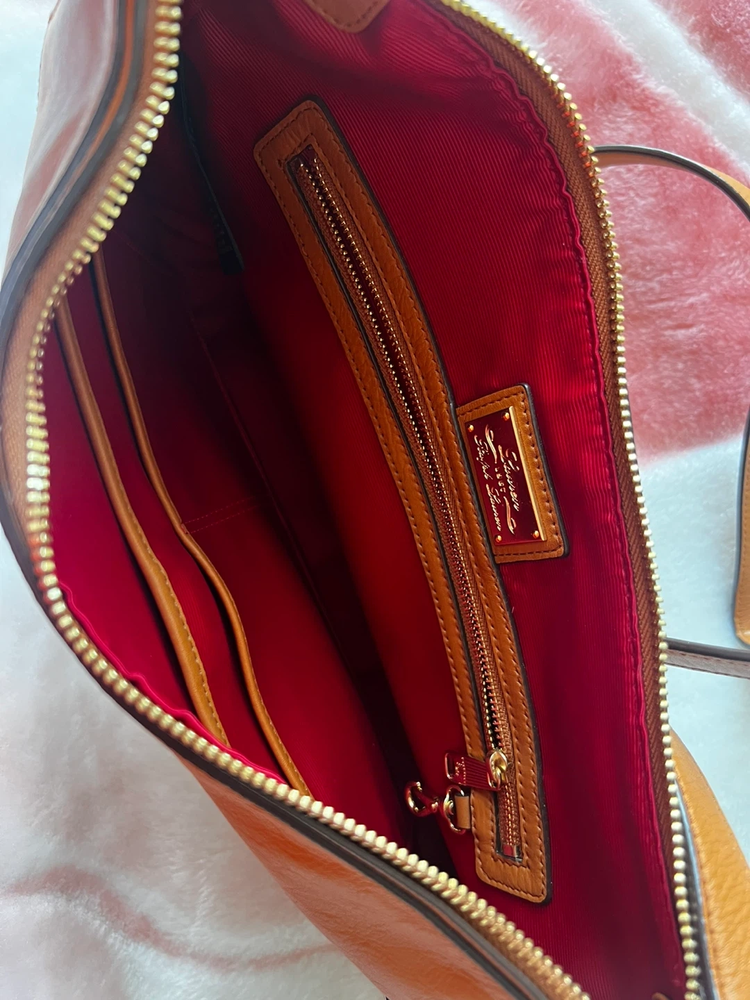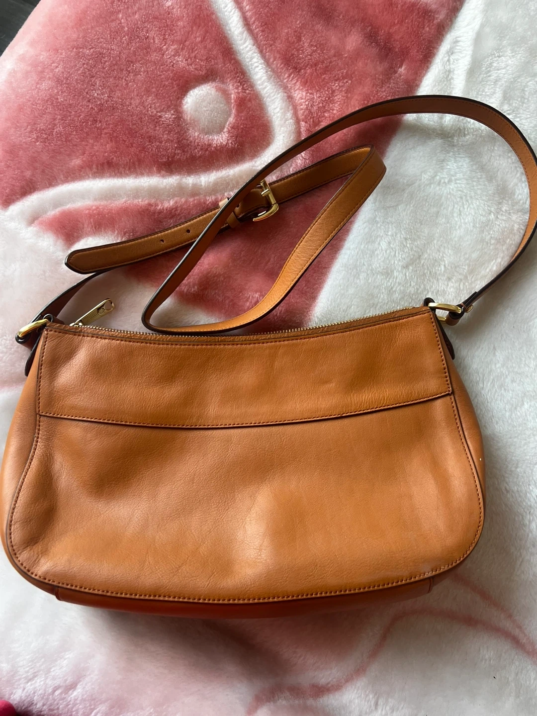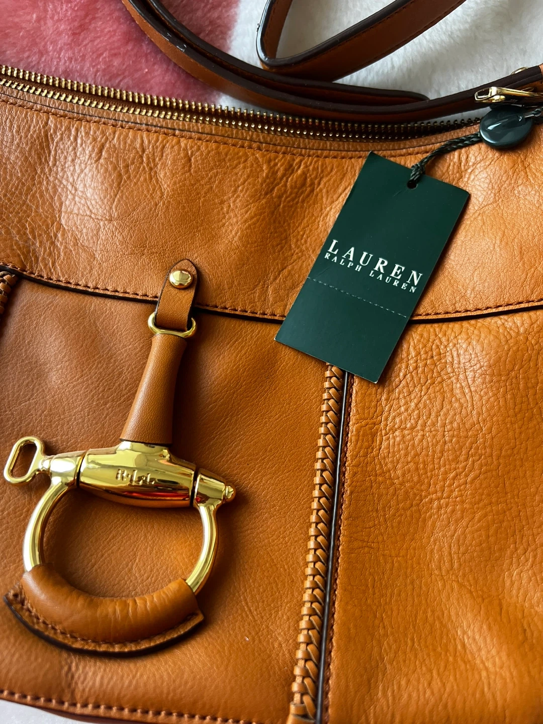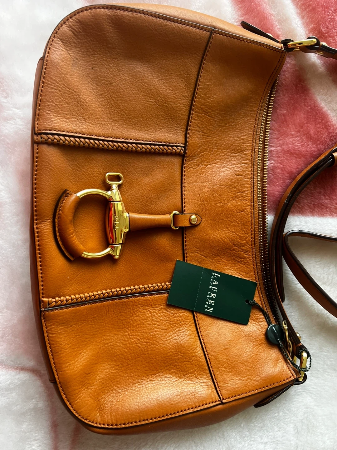 Here's a stylish Lauren Ralph Lauren shoulder bag in a lovely tan leather! It has a zipper closure and a long adjustable strap. The interior is a vibrant red with a zippered pocket and some slip pockets. Perfect for everyday use!