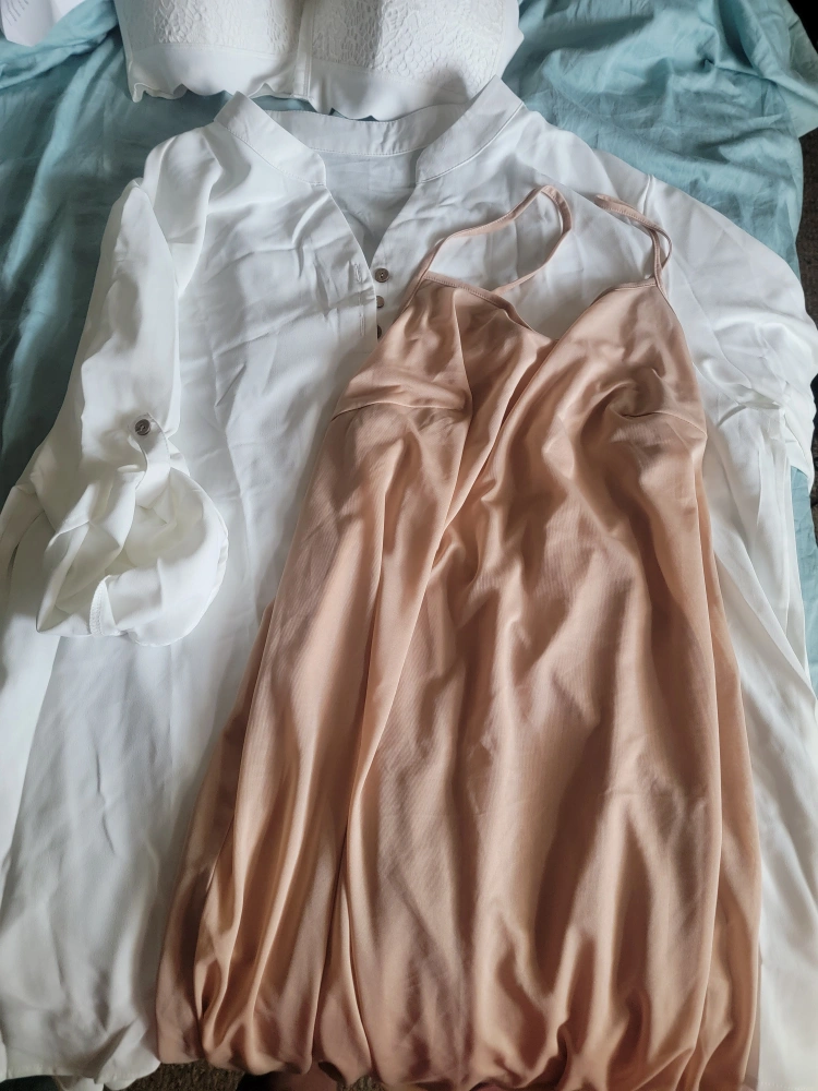 Selling a clothing bundle that includes a white blouse and a light pink dress. Both items are in good condition and ready for a new home!