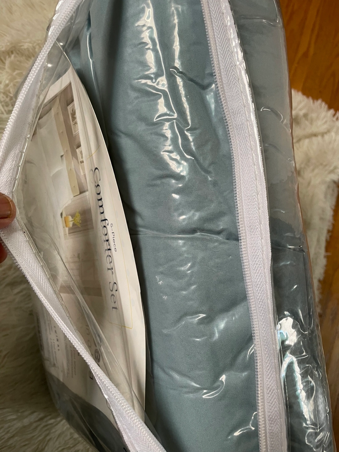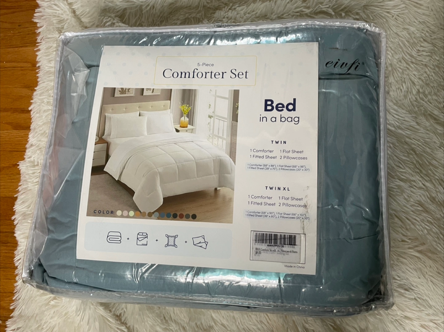70Selling a brand new, still-in-packaging 5-piece comforter set. It's a 'bed in a bag' style set, perfect for a twin-sized bed. Includes one comforter, one flat sheet, one fitted sheet, and two pillowcases. The colour is a lovely, calming blue-grey tone. It is made in China.