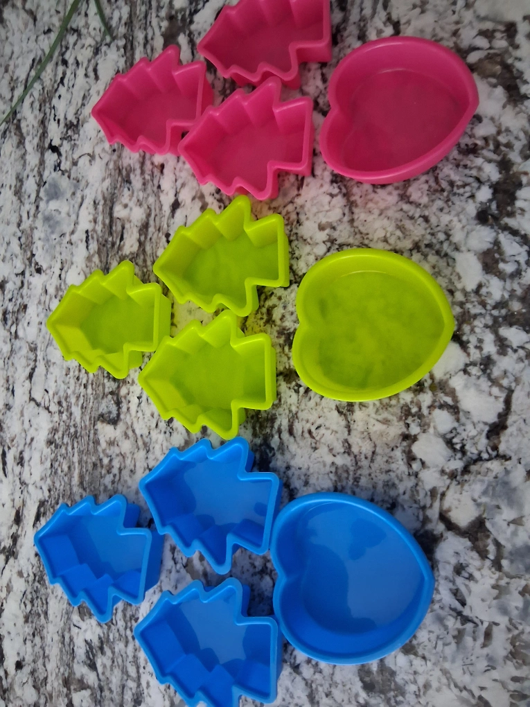 I have a set of colourful silicone baking molds! There are tree and heart shapes in pink, green, and blue. Great for baking or crafting!