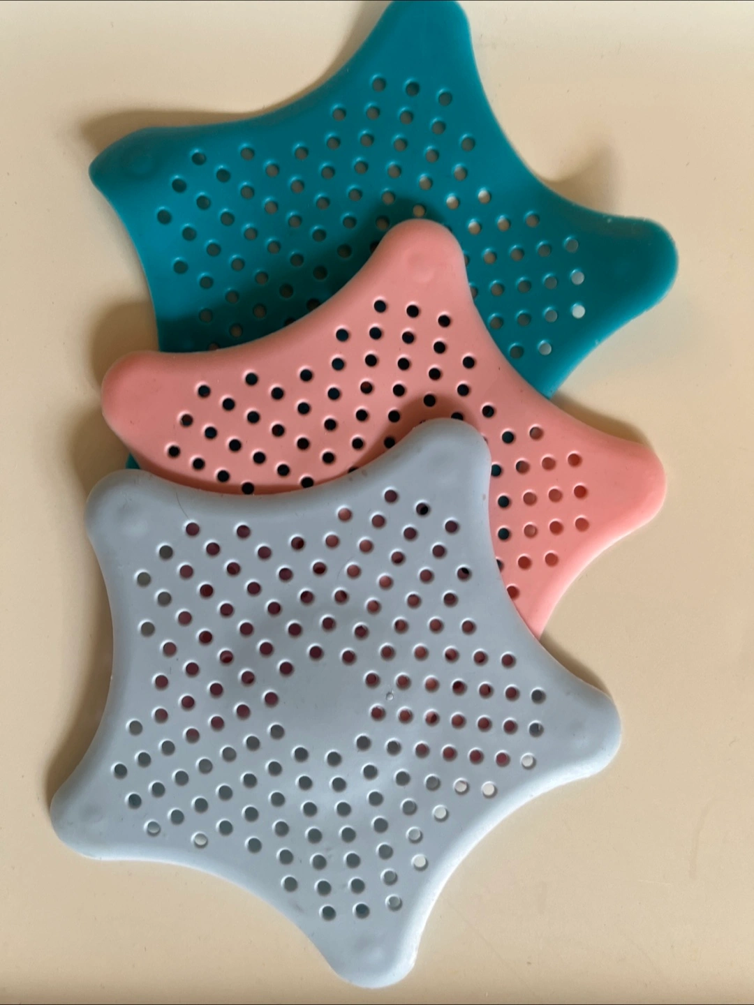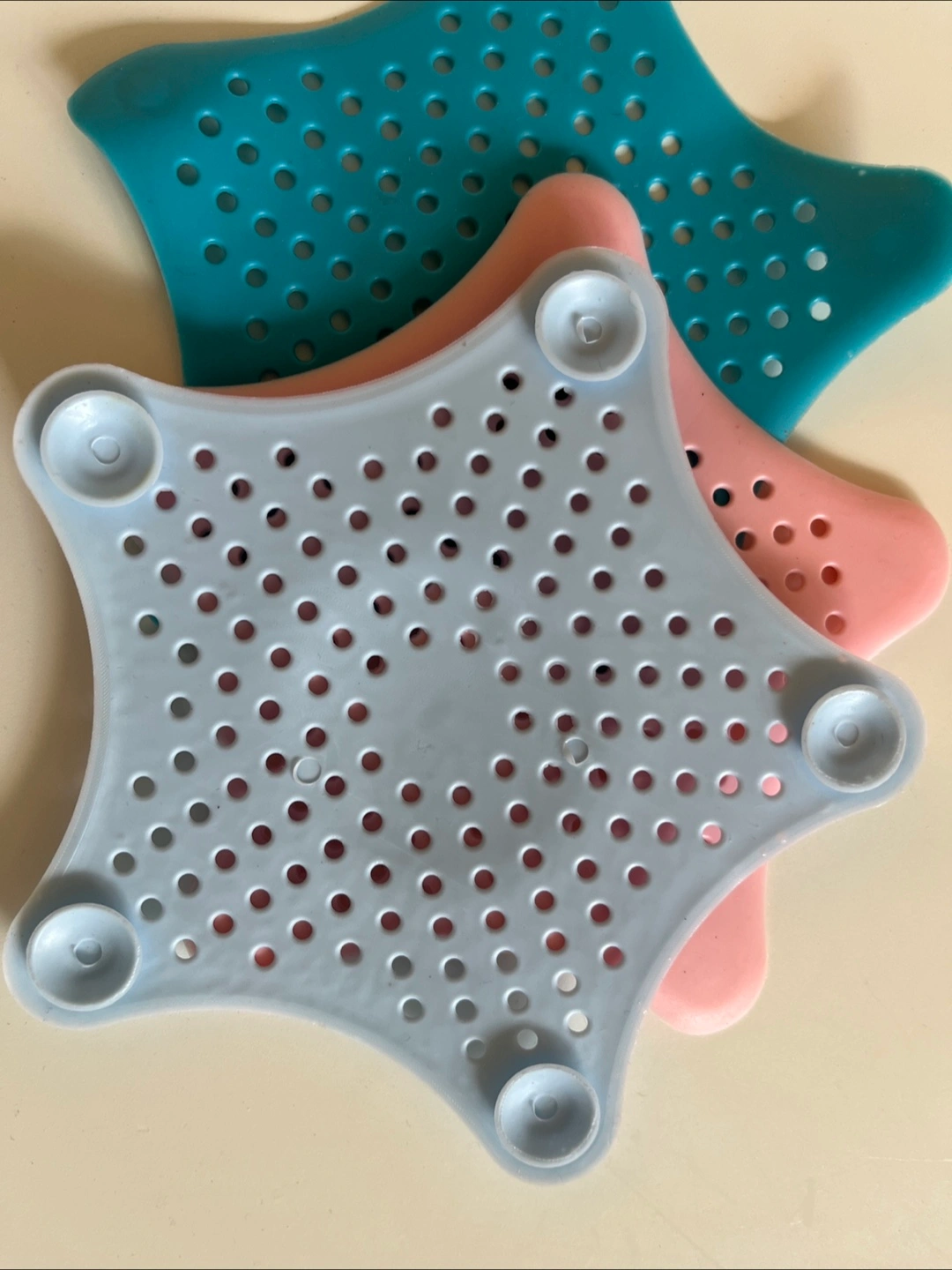 Selling a set of three drain covers in teal, pink and grey. They have suction cups on the bottom to keep them in place. Great for keeping hair and debris out of your drains!