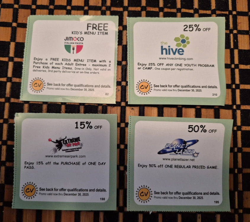 I have a collection of coupons for local businesses: - Jimoco Italian Pasta: Free kid's menu item with adult entree purchase - The Hive climbing: 25% off any youth program or camp - Extreme Airpark: 15% off one day pass - Planet Lazer: 50% off one regular priced game All coupons are valid until December 30, 2025