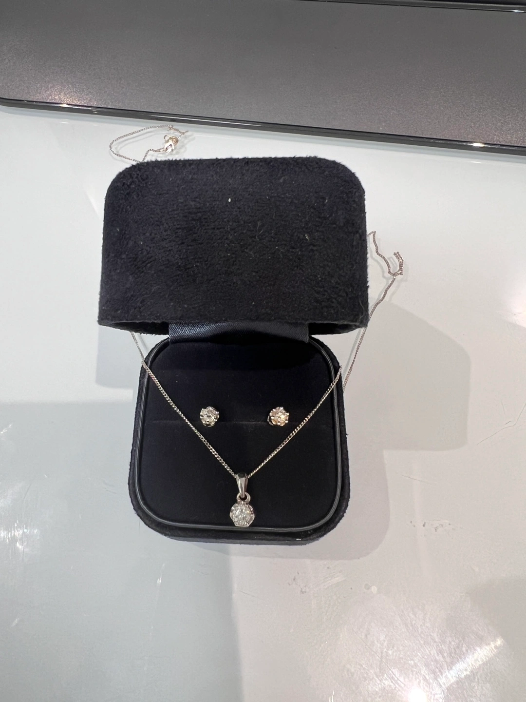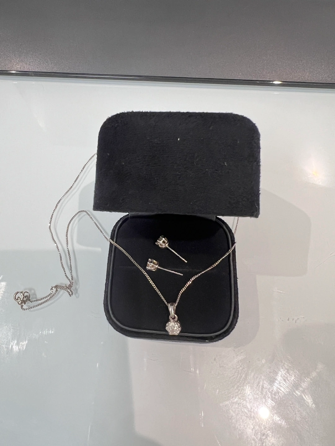 Selling a beautiful authentic diamond necklace and earring set. It comes in its original box and is in great condition. Diamond Necklace and Earring Set-authentic diamond +14 k white gold. Earning stoppers are missing.