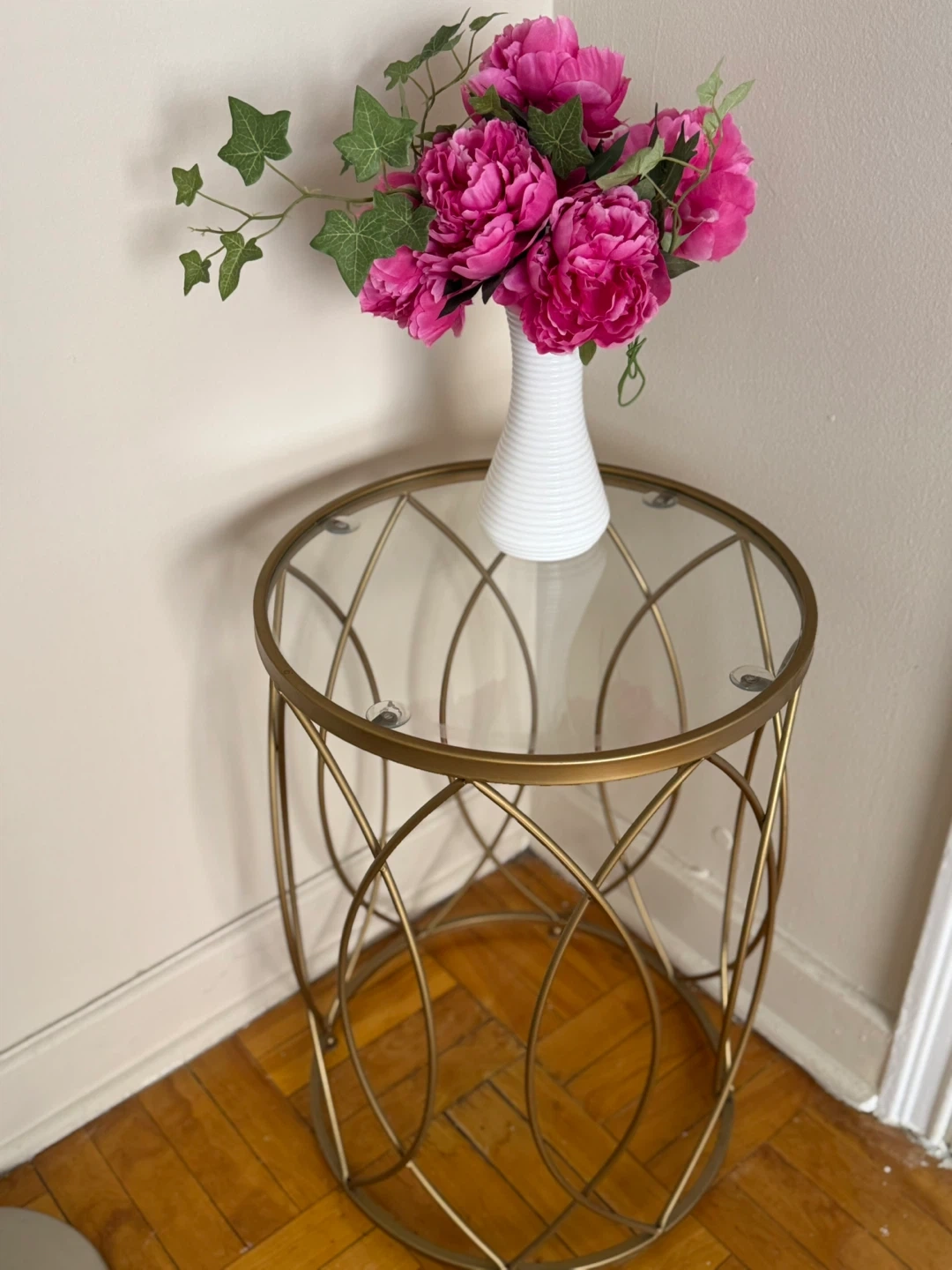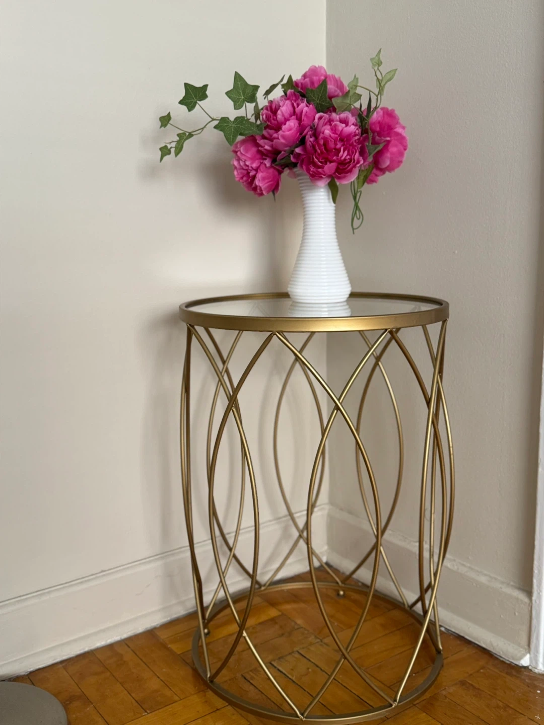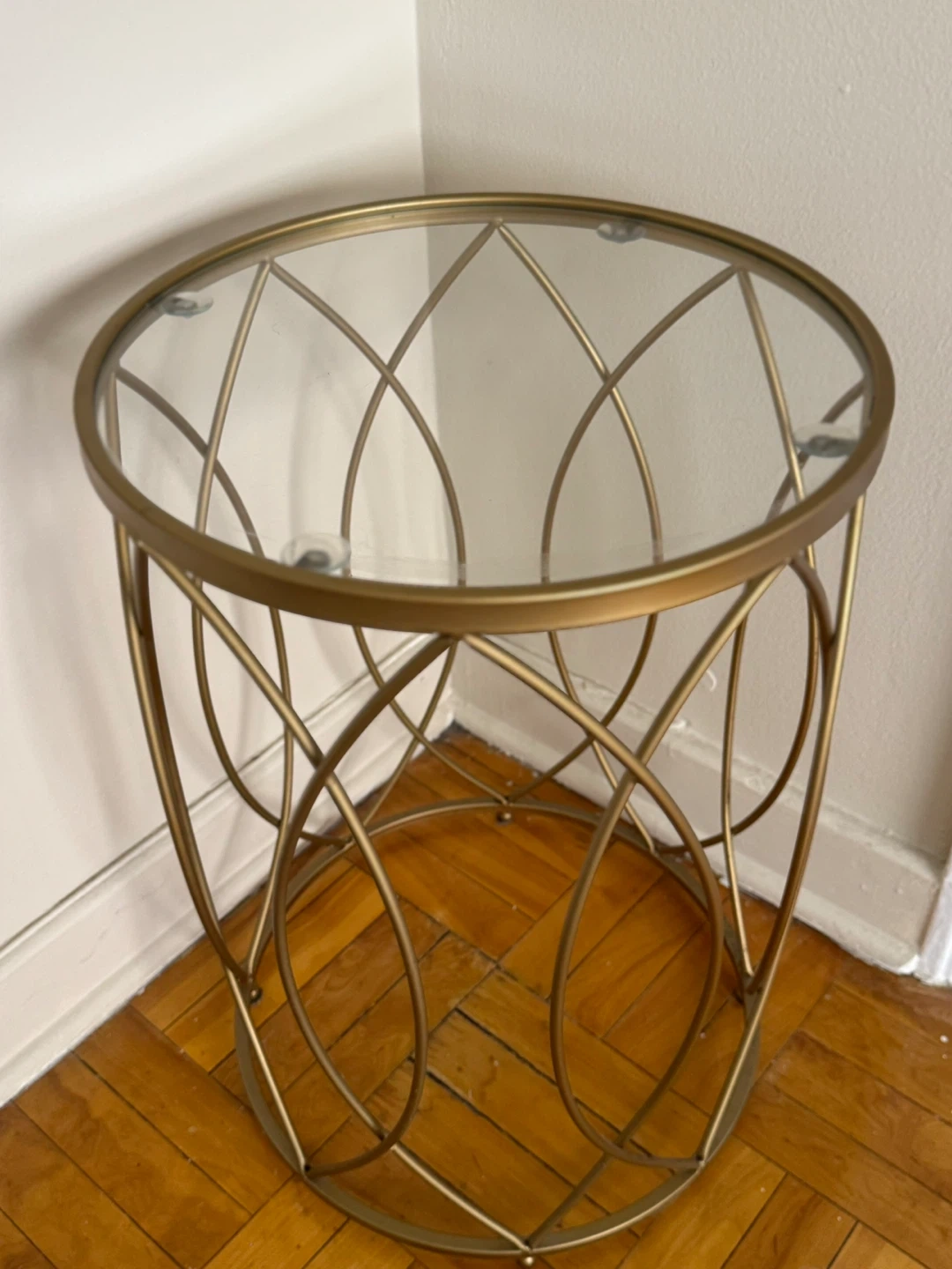 Selling a lovely accent table with a gold metal base and a glass top. It's perfect for adding a touch of elegance to any room. The table is in great shape and ready for a new home!