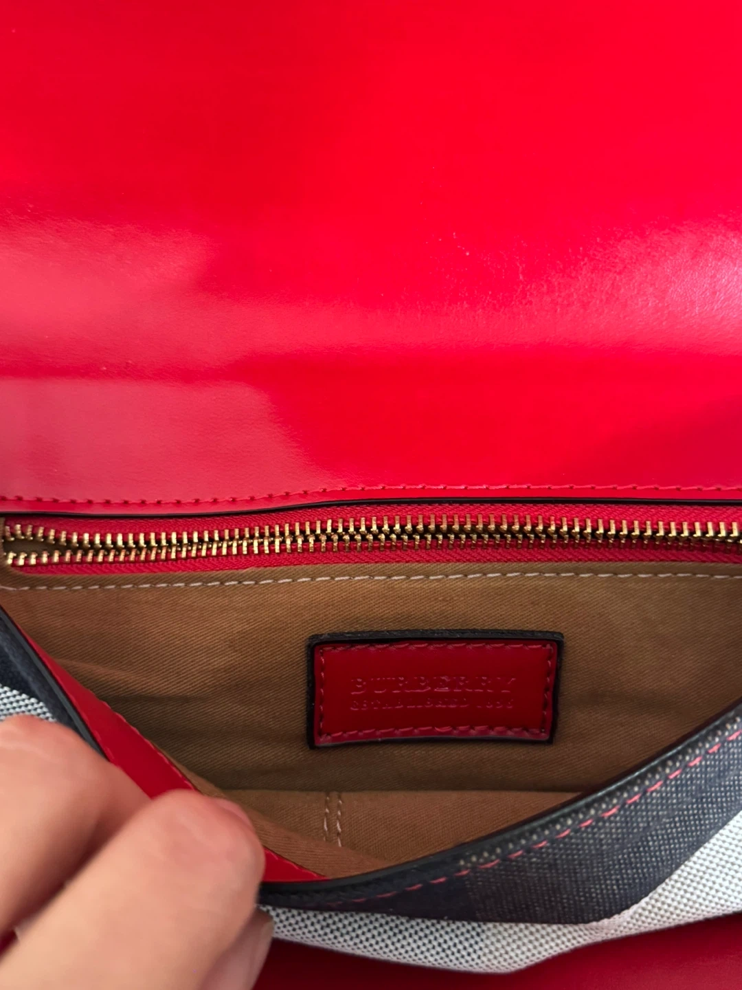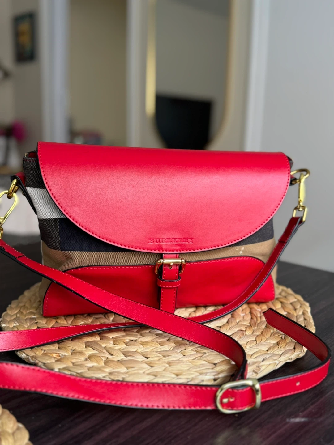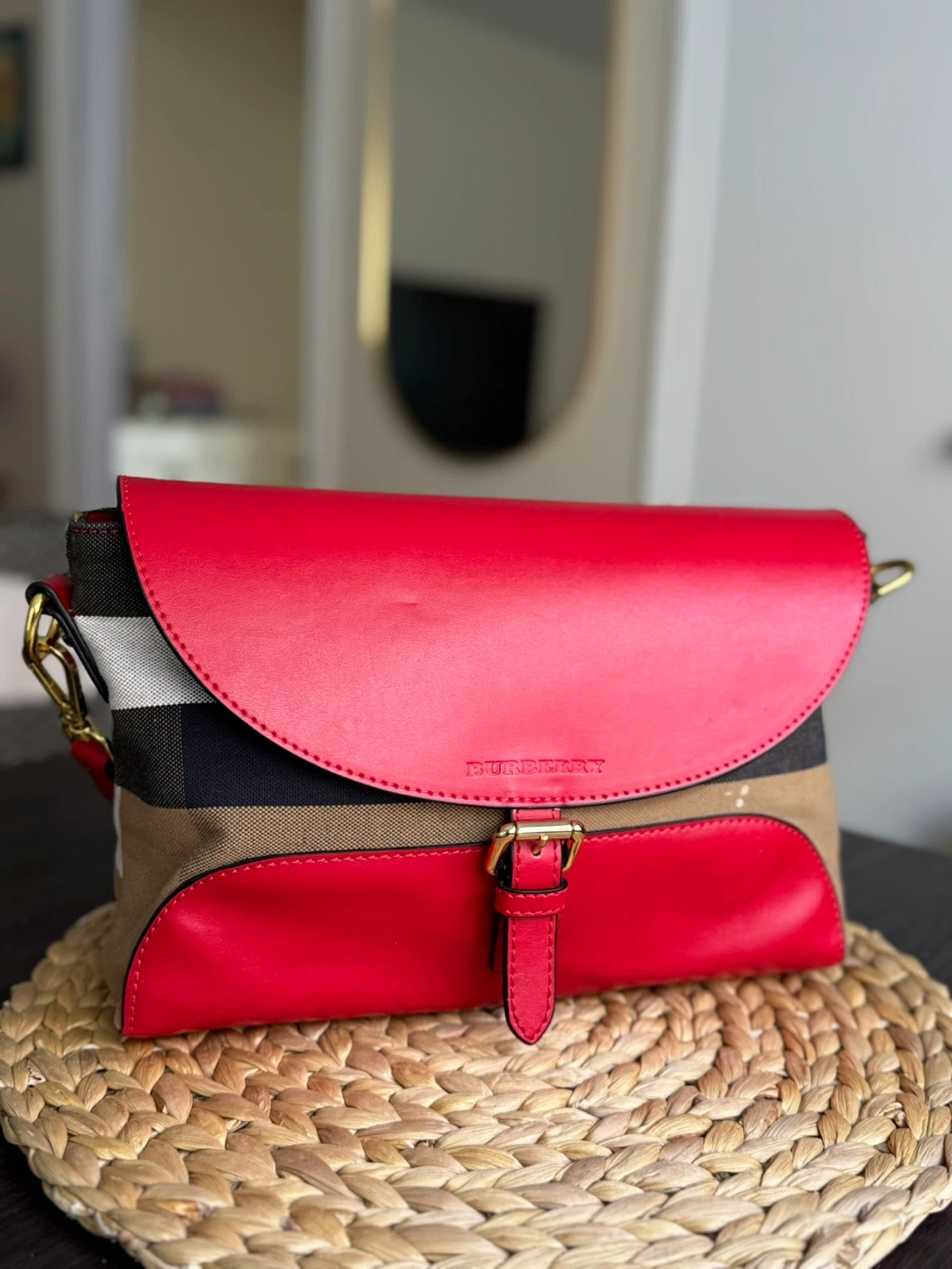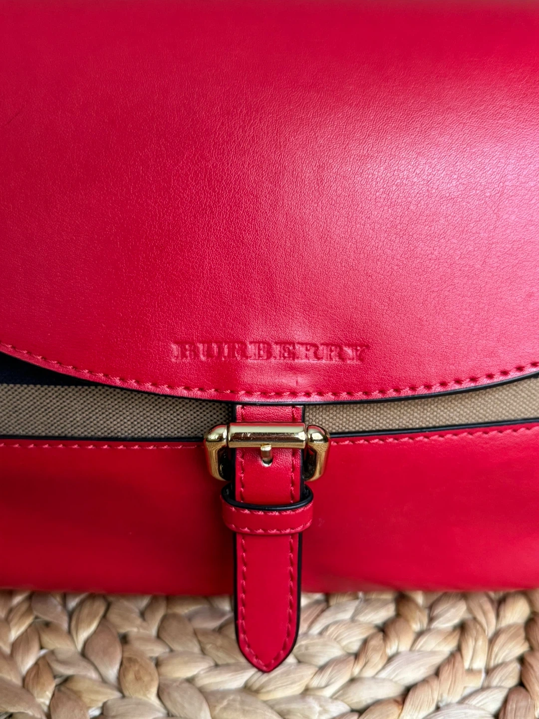 Selling a Burberry crossbody bag in a vibrant red leather! It's in great condition. The bag features a distinctive design with the classic Burberry pattern subtly incorporated. Perfect for adding a pop of colour to any outfit!