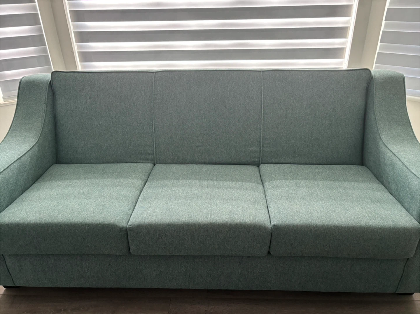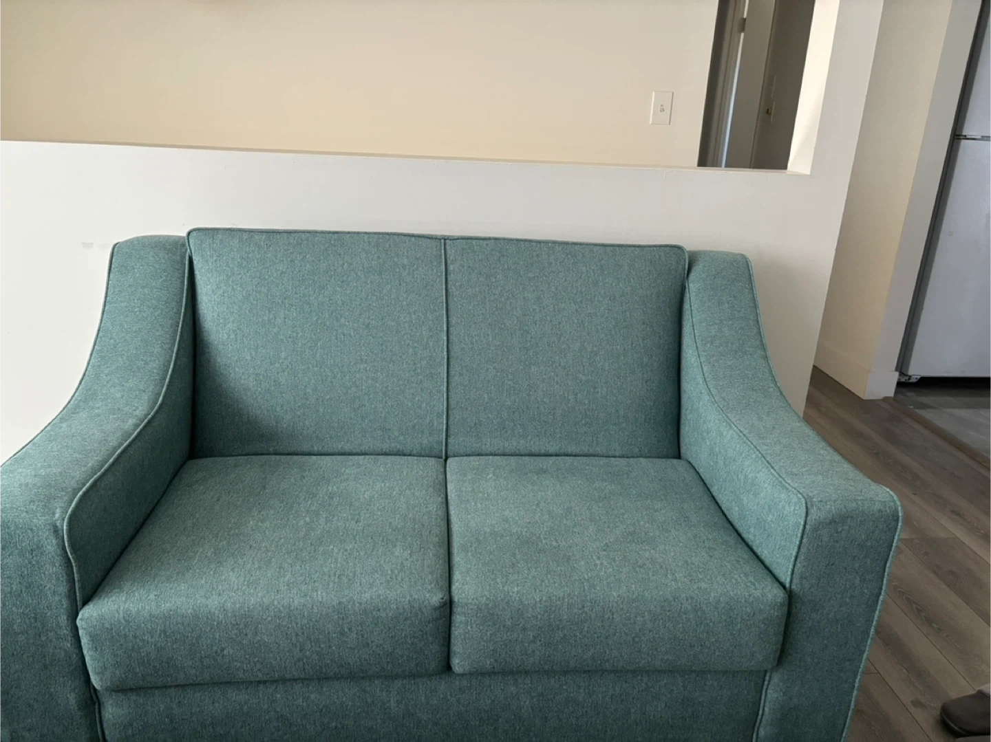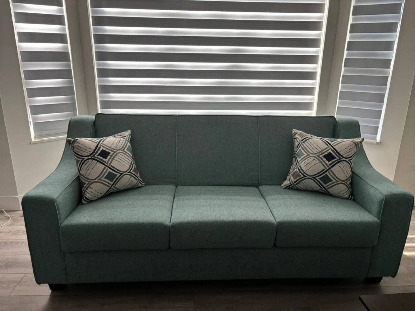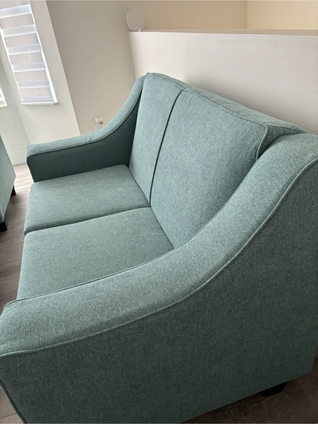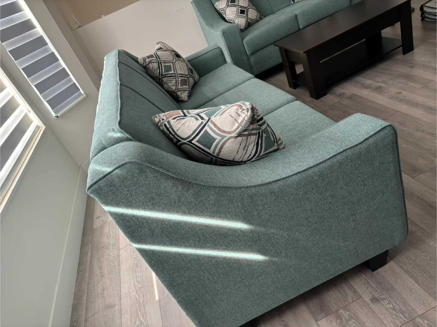 Selling a comfy sofa and loveseat set in a refreshing mint green colour! Perfect for a living room or den. Comes with two decorative pillows to complete the look. The set is in great condition and ready for a new home! Selling a modern 2-piece sofa set (3-seater + 2-seater) in excellent condition. • Lightly used – only 1 year old • Firm, supportive cushions – very comfortable • No stains, tears, or pet damage • Includes matching throw pillows • Neutral modern color that fits any living room décor Pickup only in Surrey — buyer must arrange pickup or delivery. Perfect for living rooms, family rooms, or basement suites.