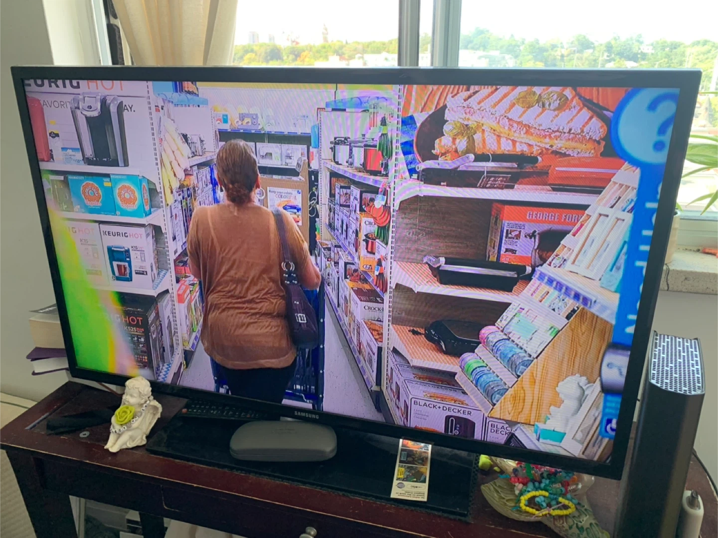 This is a Samsung TV in great condition! It's currently displaying a scene from what appears to be a shopping trip, showcasing various kitchen appliances and cookware. It's ready to bring your favourite shows and movies to life