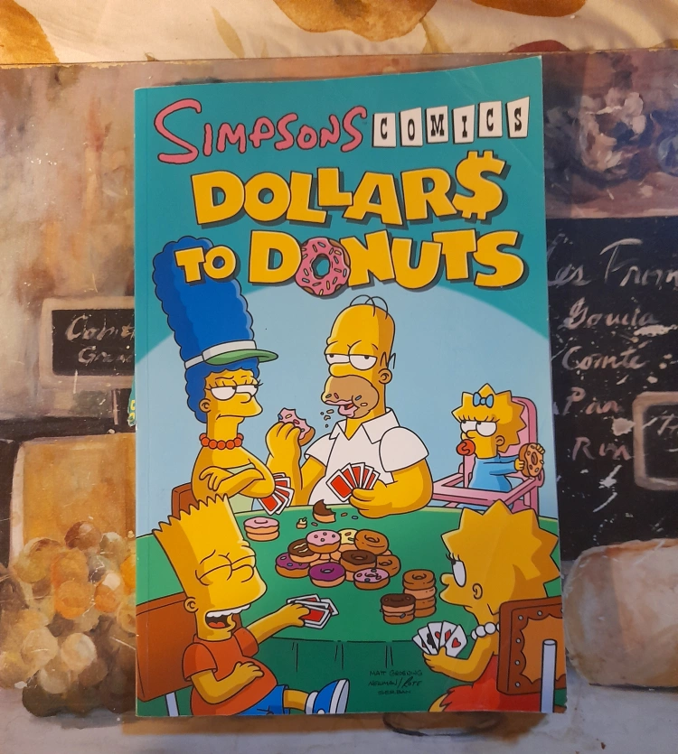Selling a Simpsons comic book titled 'Dollars to Donuts'! It's in great shape and features the whole family. Perfect for any Simpsons fan or comic book collector