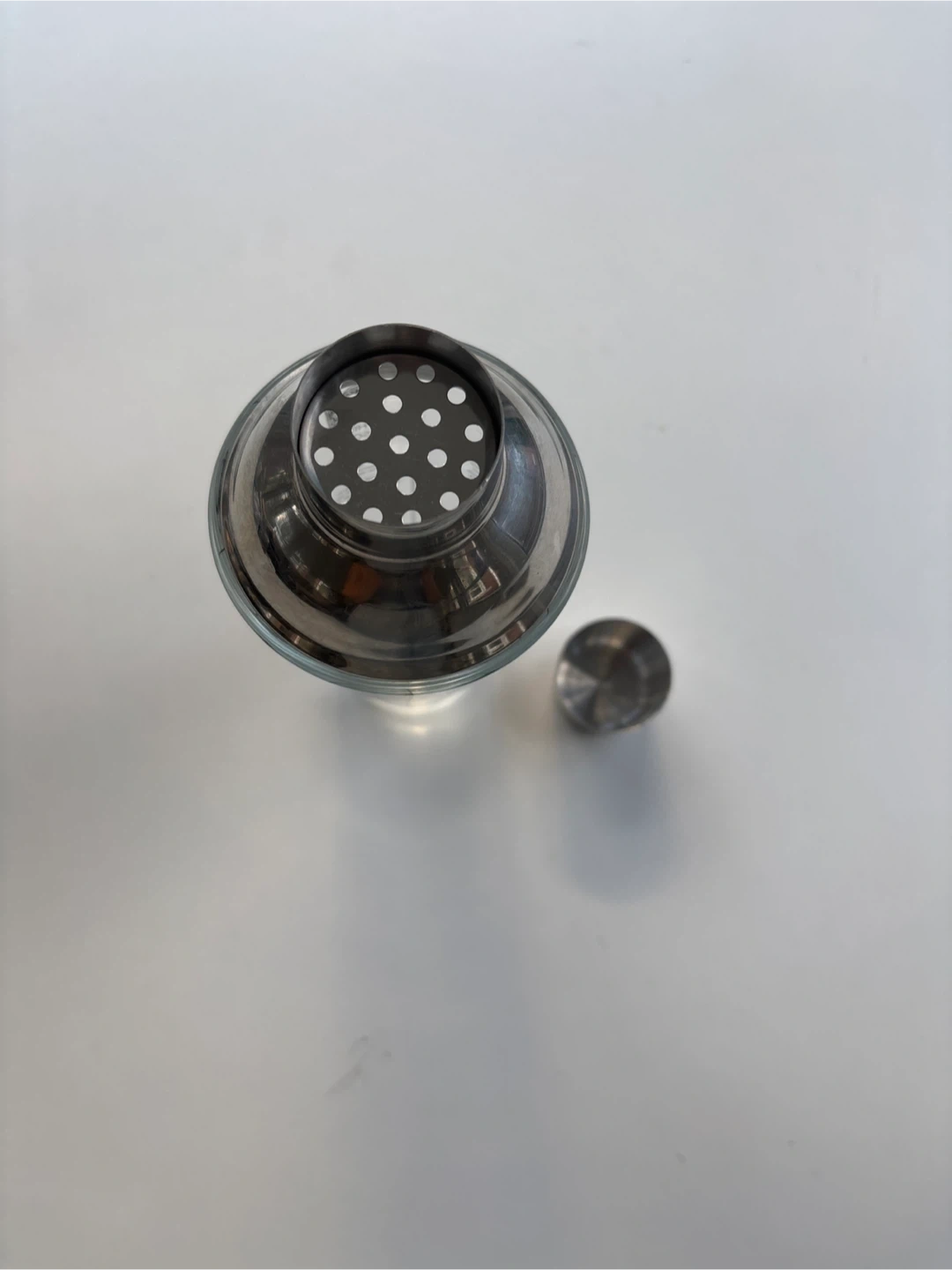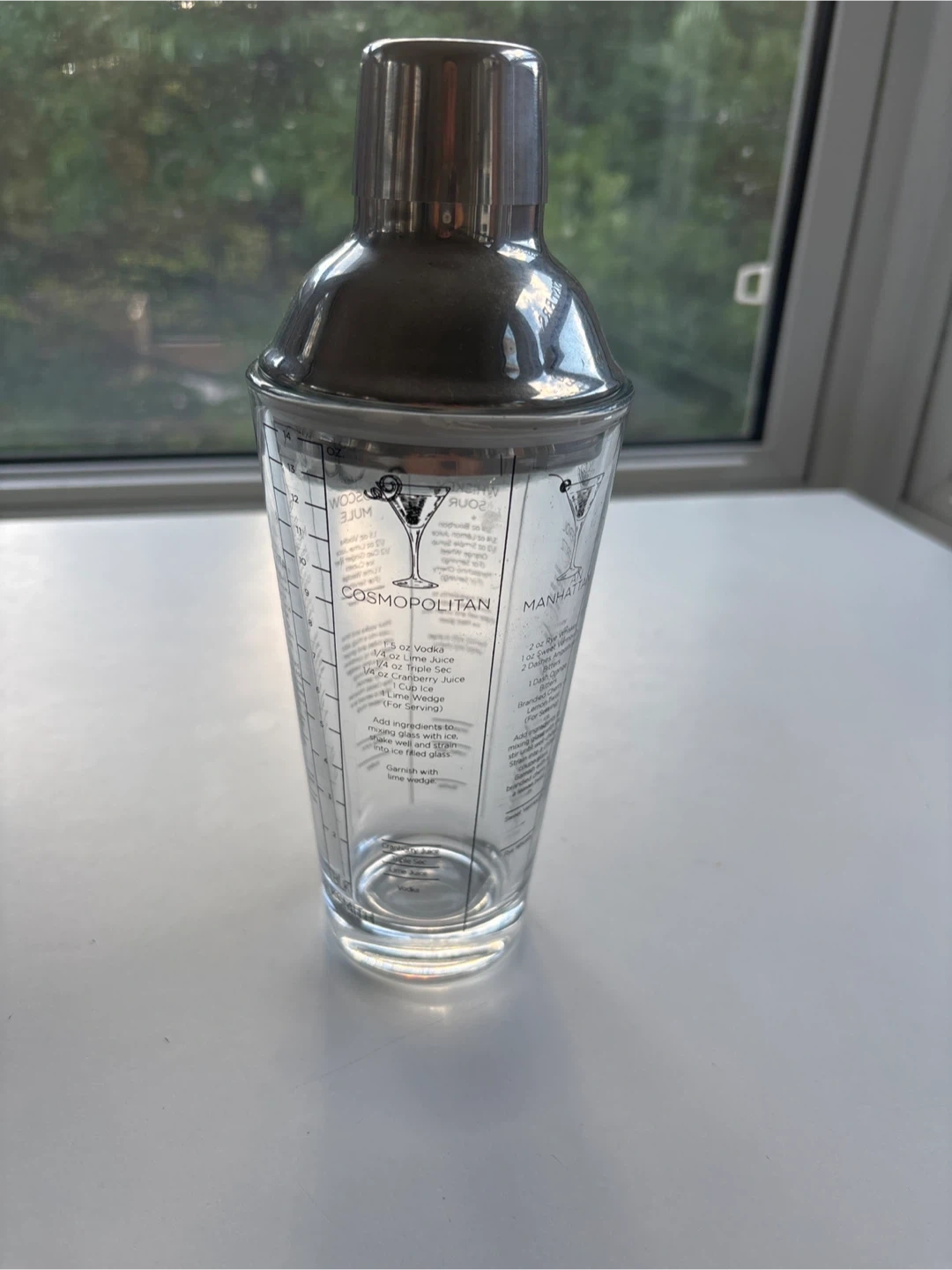 I'm selling a cocktail shaker! It's in great shape and ready to help you mix up some delicious drinks. The shaker has recipes printed right on the glass for easy cocktail making, including classics like Cosmopolitans and Margaritas