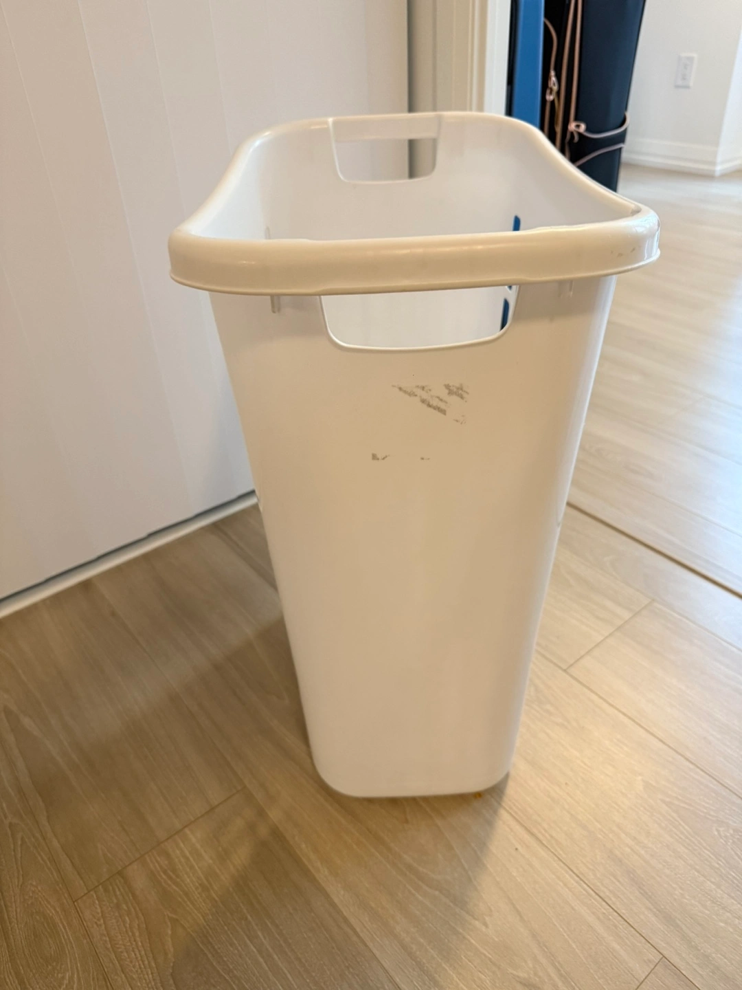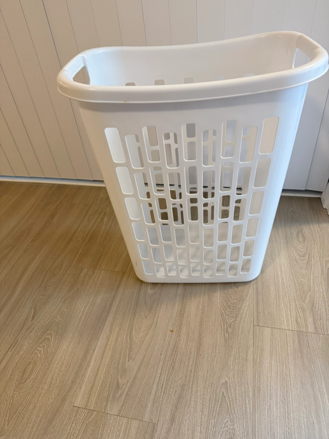 Selling a white plastic laundry basket. It's in good condition and ready to haul your clothes to the laundry room. Perfect for keeping things organized!