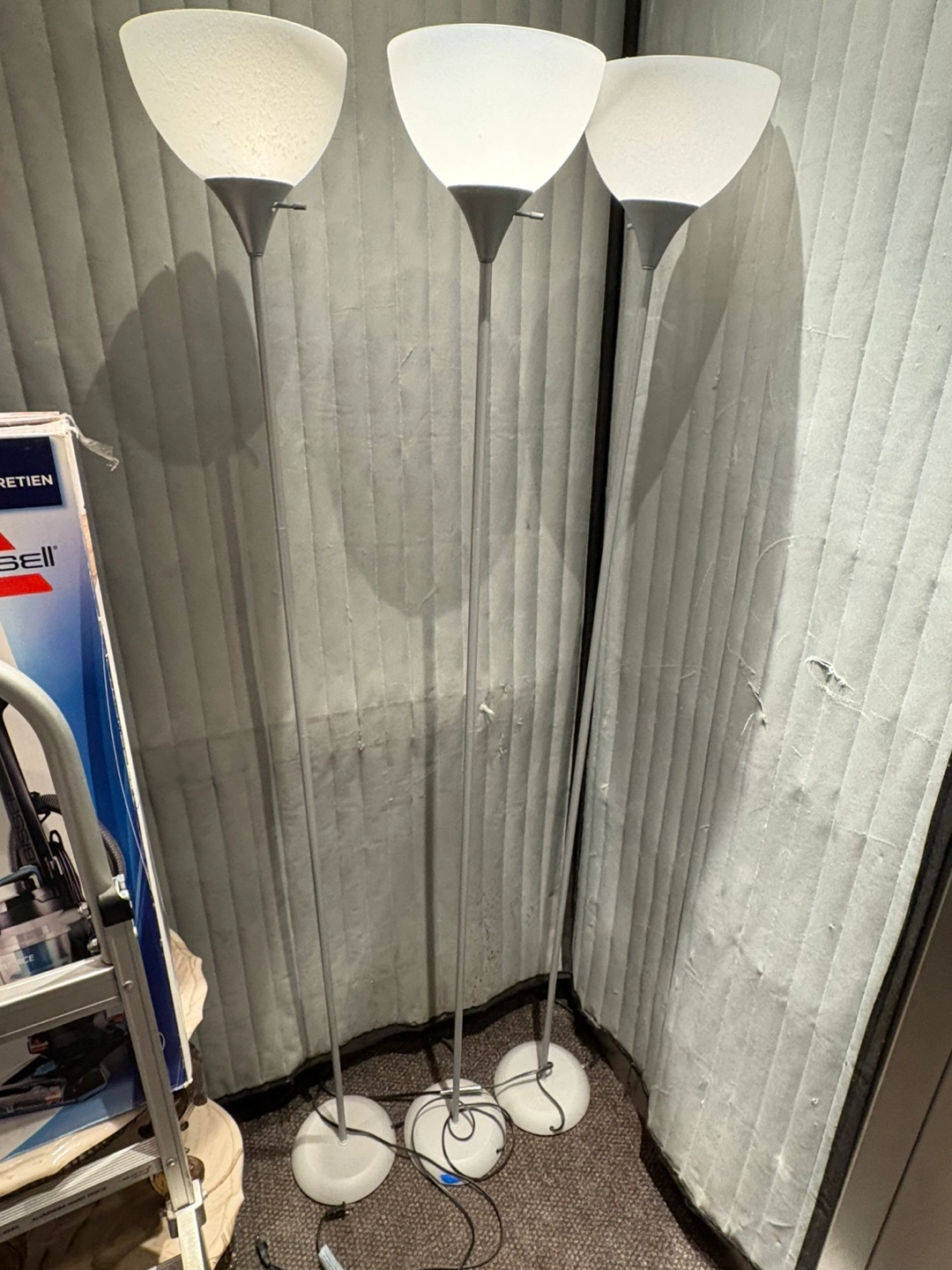 Selling a set of three floor lamps. They have a simple, modern design with a frosted glass shade and a slender silver pole. These lamps would be a great addition to any living room, bedroom, or office space