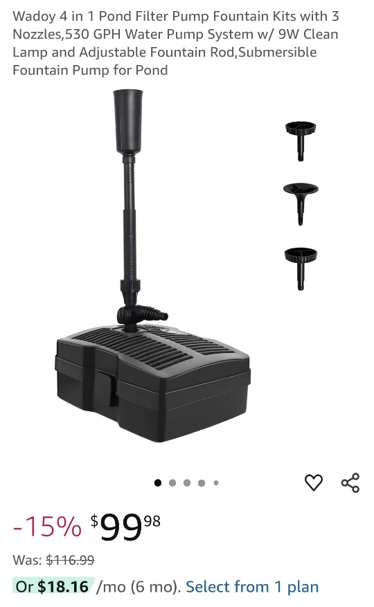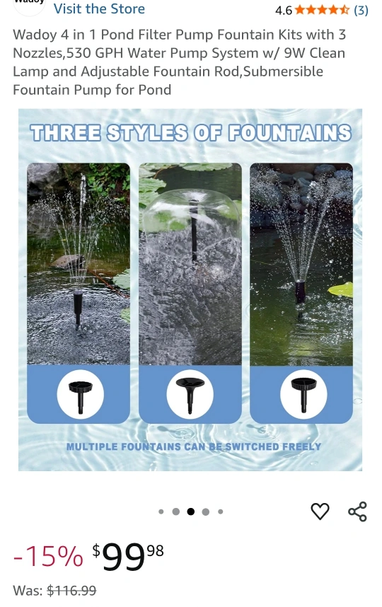 Selling a Wadoy 4-in-1 pond filter pump fountain kit! It comes with 3 nozzles, a 530 GPH water pump system with a 9W clean lamp, and an adjustable fountain rod. It's also a submersible fountain pump for your pond!