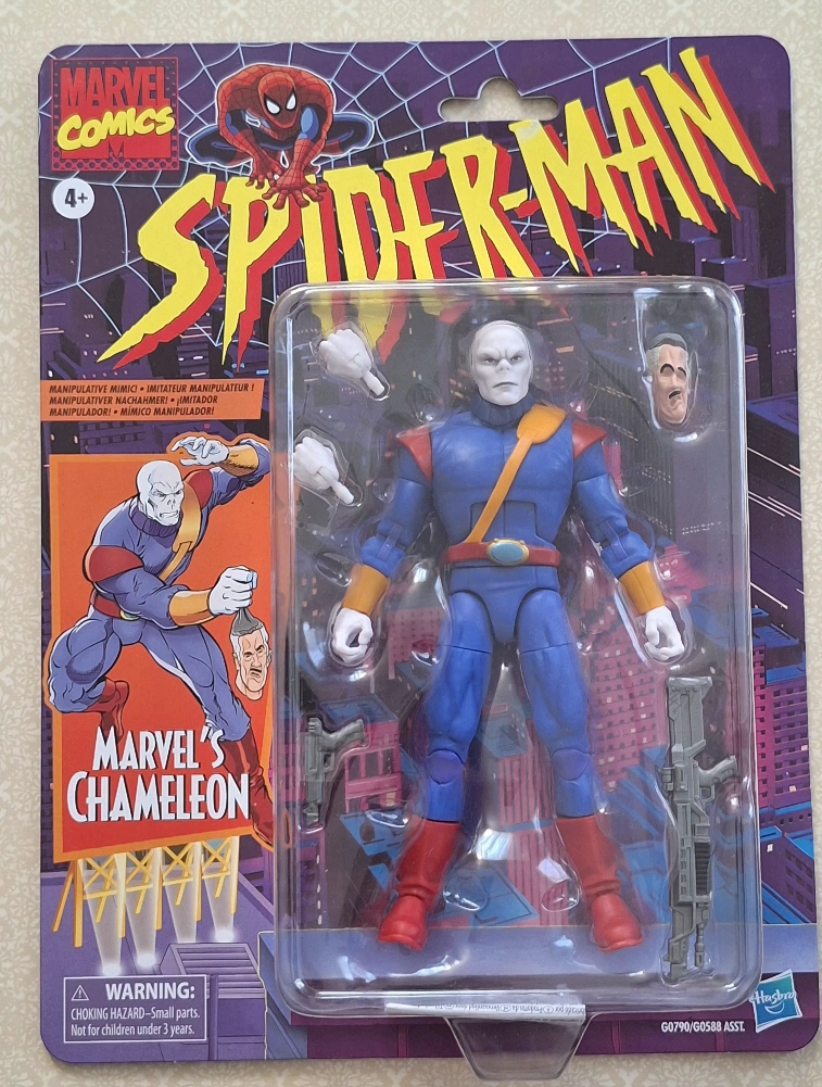 Selling a Marvel Comics Spider-Man action figure of Marvel's Chameleon. This figure is part of the retro collection and is in its original packaging. It is suitable for ages 4+