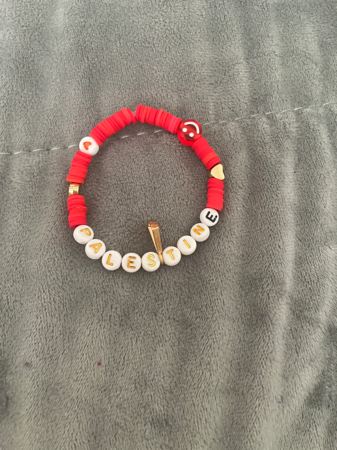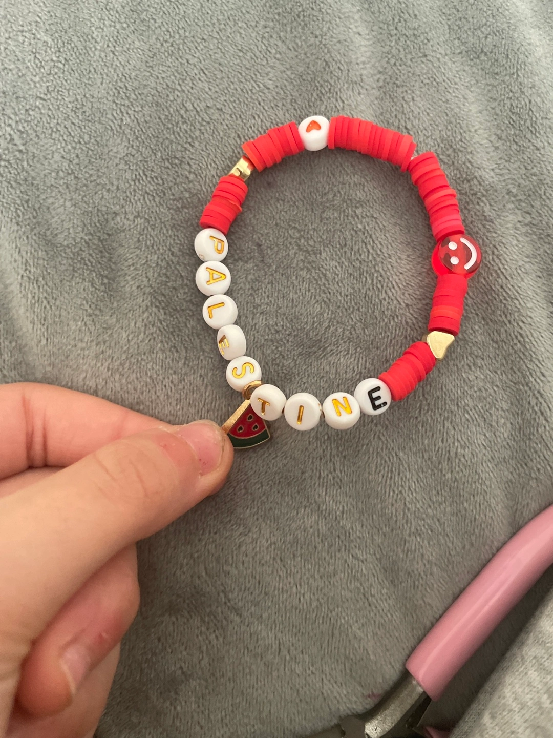 Handmade bracelet with red and white beads spelling out Palestine. It features a watermelon charm and cute smiley face bead. Perfect for showing your support