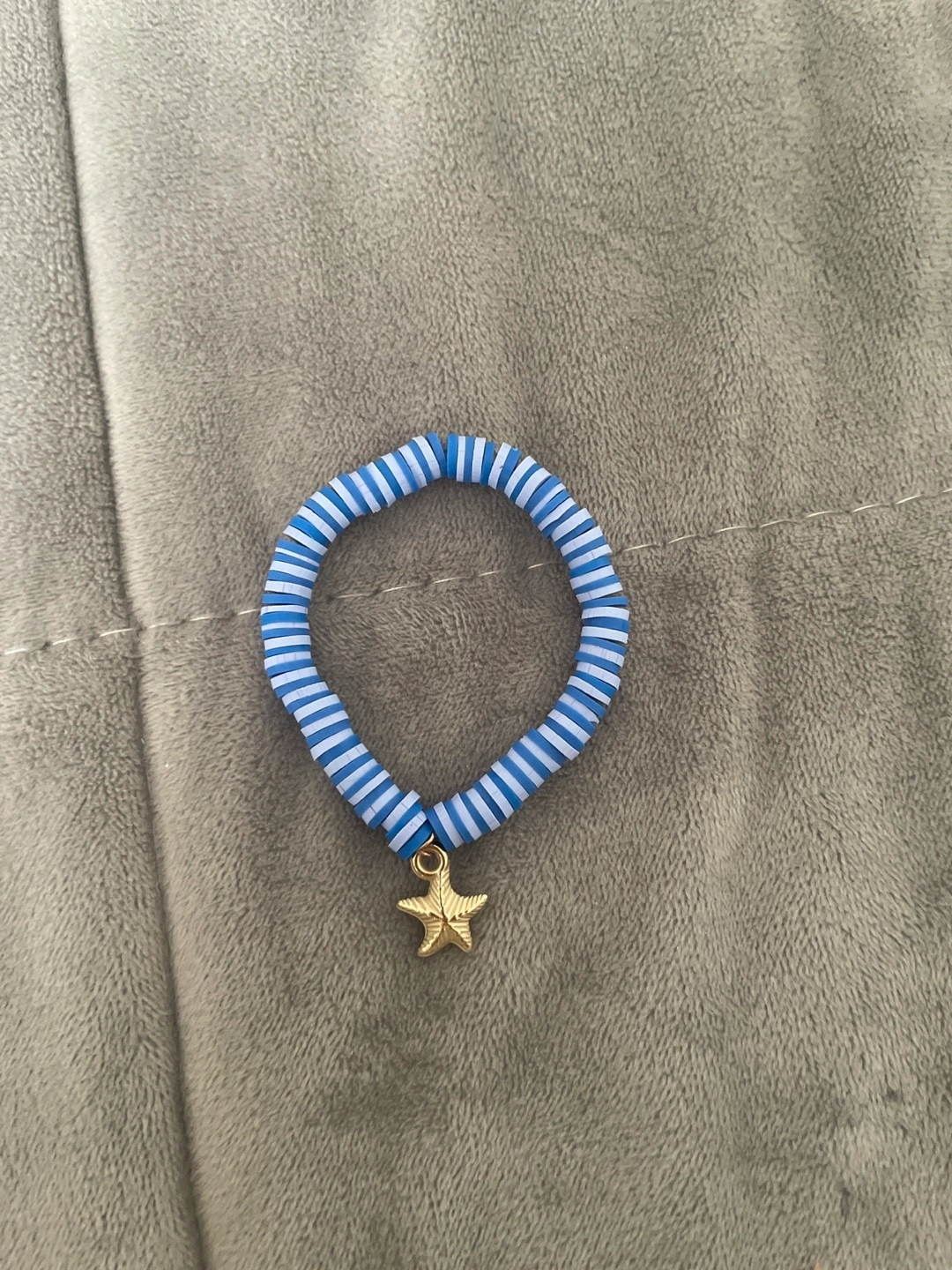 This is a cute blue and white striped heishi bead bracelet! It also has a gold star charm. Perfect for summer!