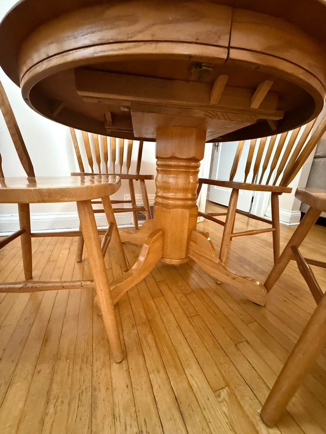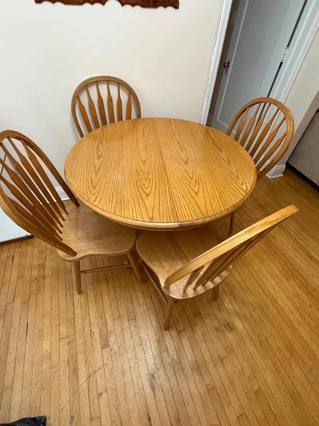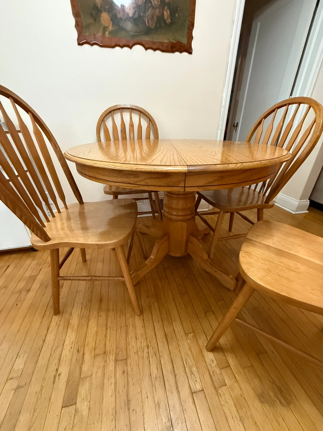 Selling a round wooden dining table that can be extended with an additional leaf. It comes with six matching chairs. The set is in good condition and would be perfect for a smaller dining space or kitchen. The table and chairs have a classic, timeless look. $100.00 for the FULL SET!!! Cash payment only. 🔧 Please bring help to move/load items and vehicle that will fit items. 📍Pickup in Brampton-Torbram Rd and Steeles Ave E area. Solid wood dining table set with: • Round table that expands to oval with leaf insert (leaf insert is included -see pics) • 6 matching wooden chairs (sturdy and comfortable). • Timeless design; perfect for family meals or entertaining. Leaf insert makes it easy to switch between cozy and spacious! Great for kitchen or dining room. ✅ Solid wood, not particleboard ✅ Clean and in good condition Approximate dimensions- Table without insert is 42 diameters Height of table is 30 inches Table with the insert is 60 inches by 42