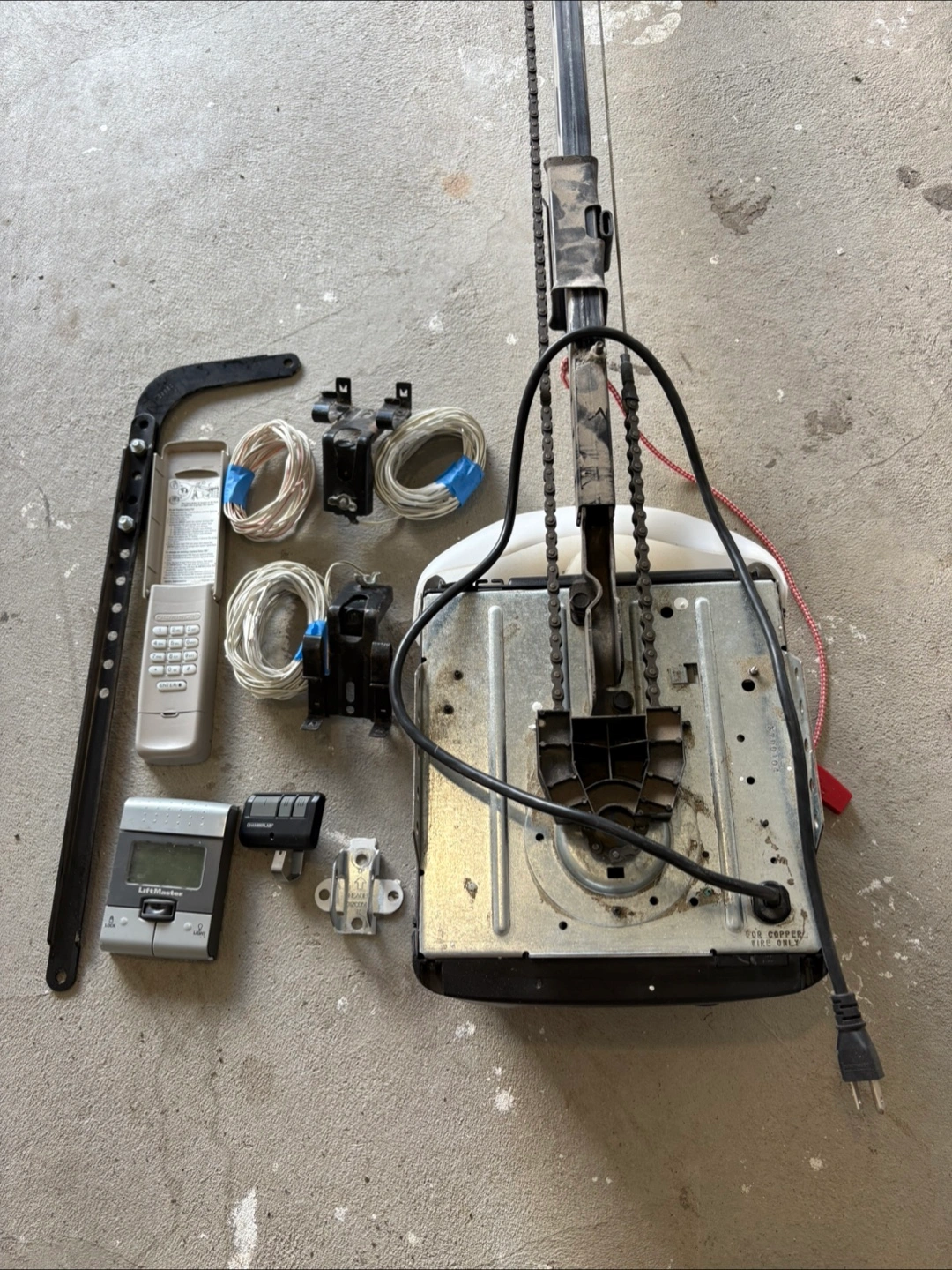 Chamberlain 1/2 HP Garage Chain Drive Door Opener (Purple learning button) with: - 1 x Control unit with screen (time, temp, config) - 1 x control unit full length wire - 2 x sensors with full length wire - 1 x 3 button opener ๐ฅ