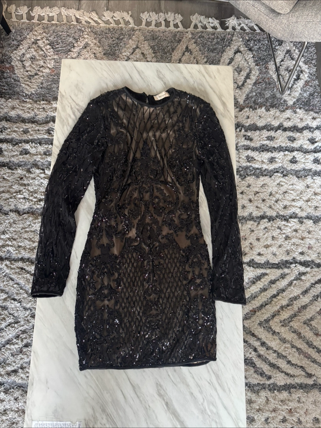 This mini dress features beautiful embellishments and a stylish open back design. It's perfect for a night out or special occasion. The dress is black and in great condition!