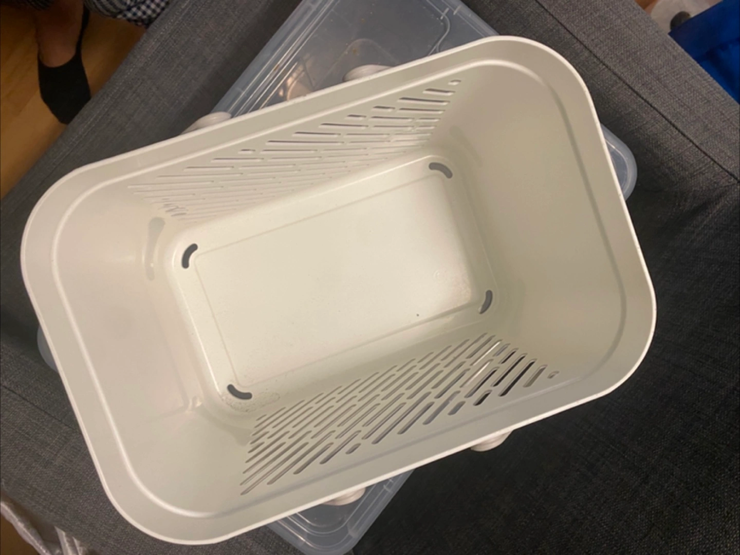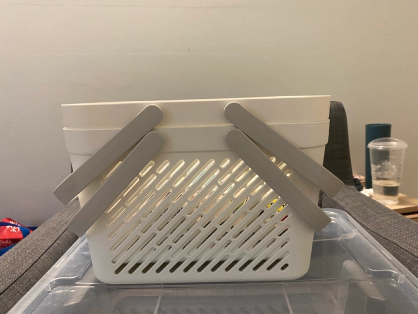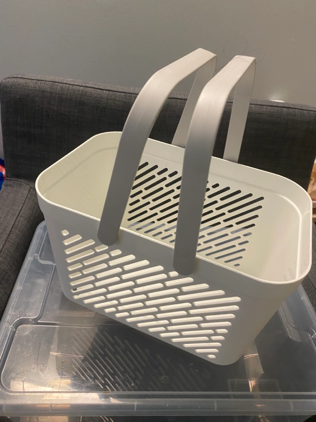 Selling a handy white plastic basket with grey handles! It's perfect for organizing things around the house, like laundry or toys. The basket is in great shape and ready for a new home. It's lightweight and easy to carry around too