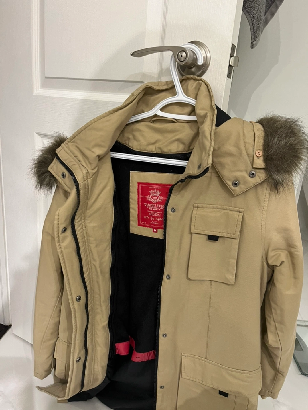 Selling a BRAND NEW edc by Esprit jacket in size medium. It features a stylish fur-trimmed hood and a classic beige colour. Perfect for staying warm and fashionable!