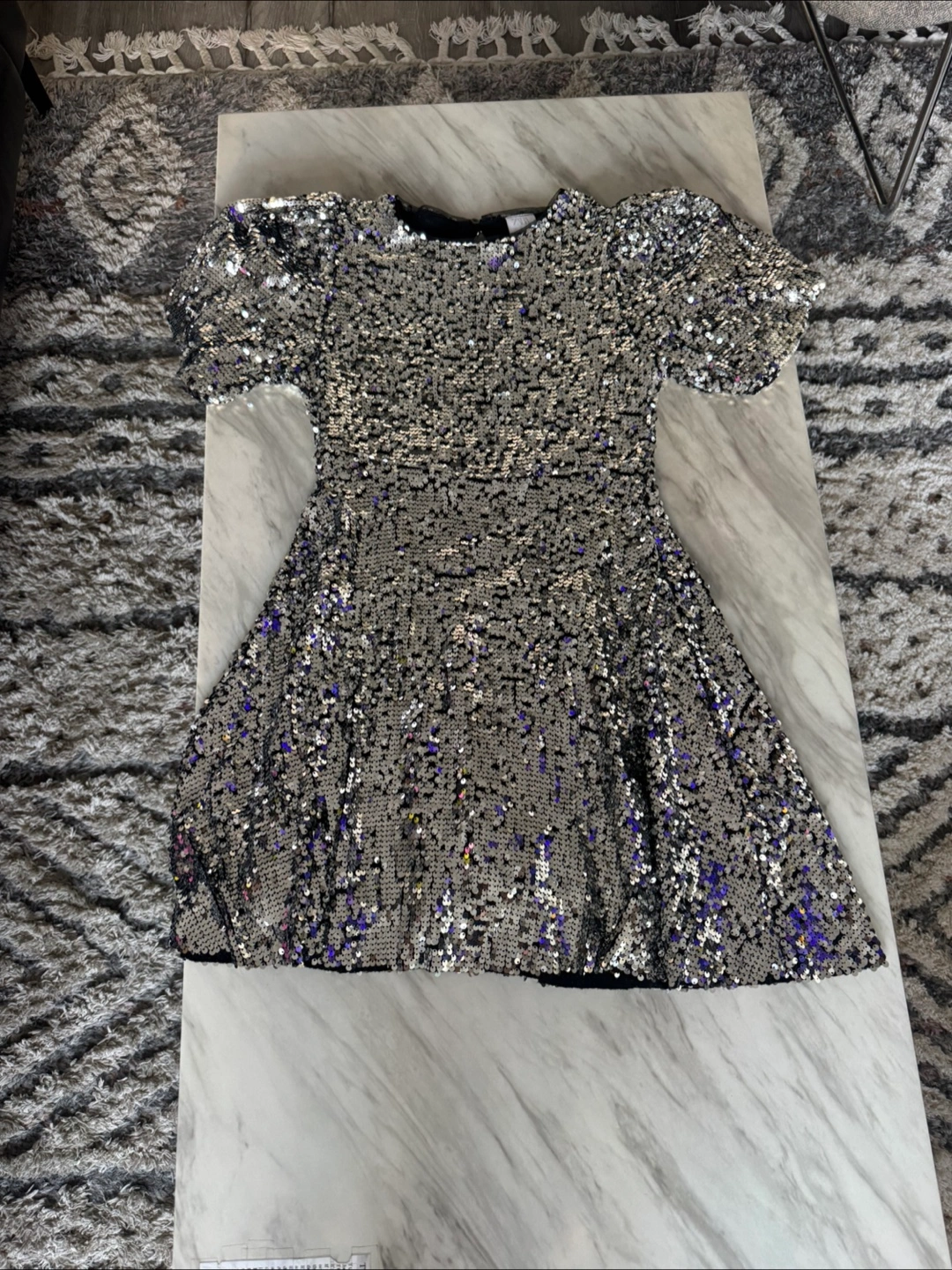 This is a cute sequin mini dress! The dress is silver with some silver sequins. It has short, puffy sleeves and a round neckline. Perfect for a night out!