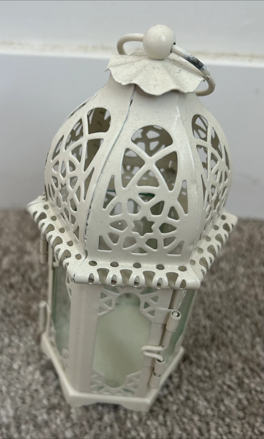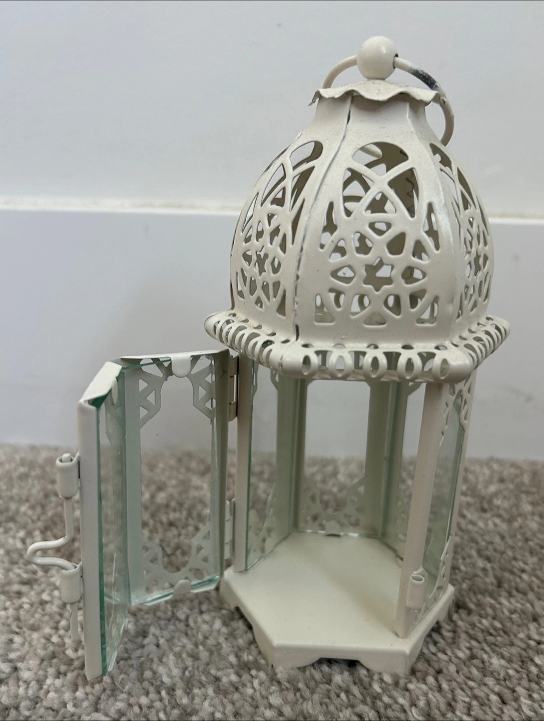 Candle Holder Decor - White Metal Lantern No scratches on glass - clean condition