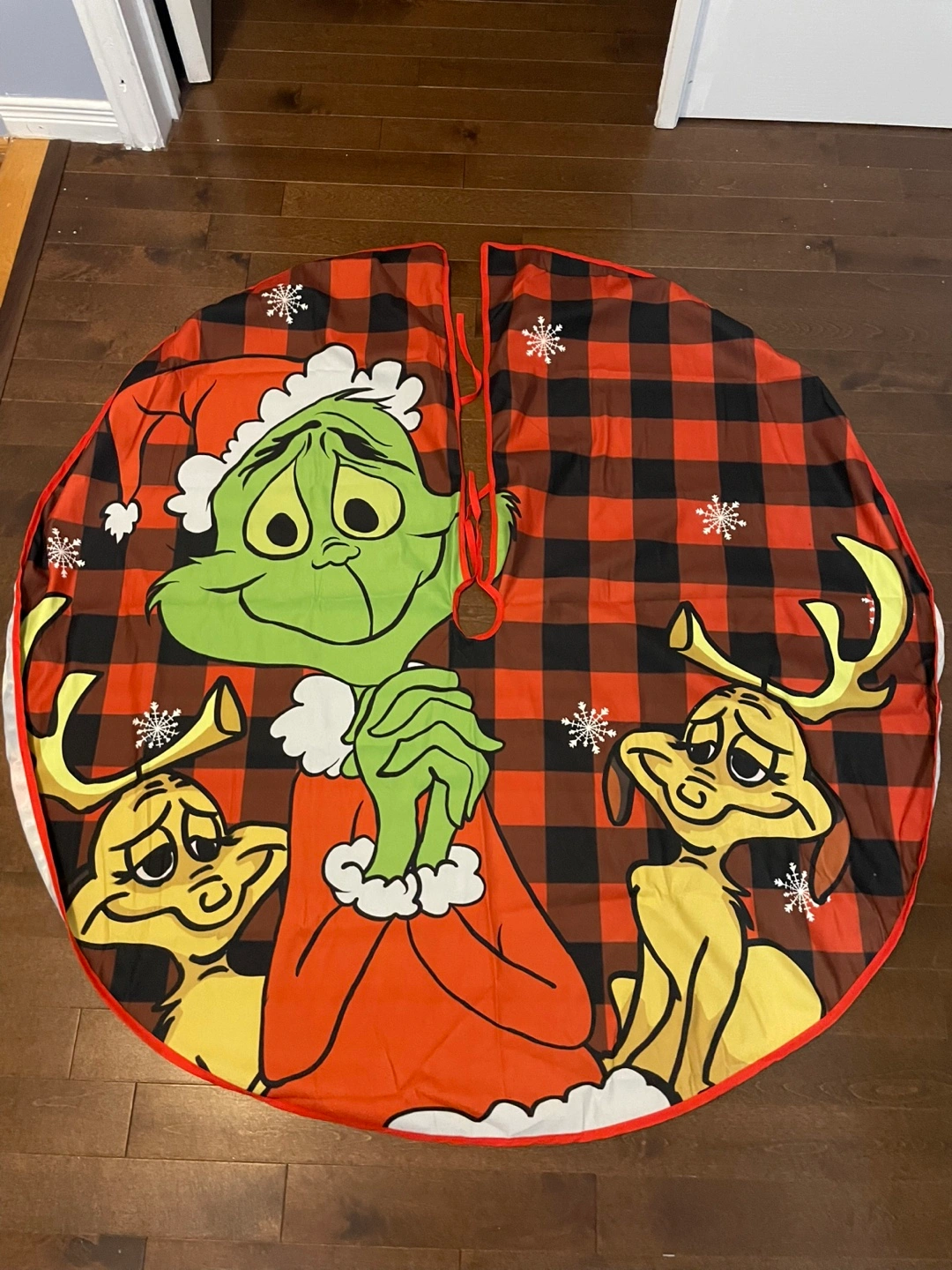 Add some Whoville charm to your Christmas tree with this fun Grinch-themed tree skirt! It features the Grinch and Max on a red and black plaid background with snowflakes. Perfect for adding a playful touch to your holiday decor