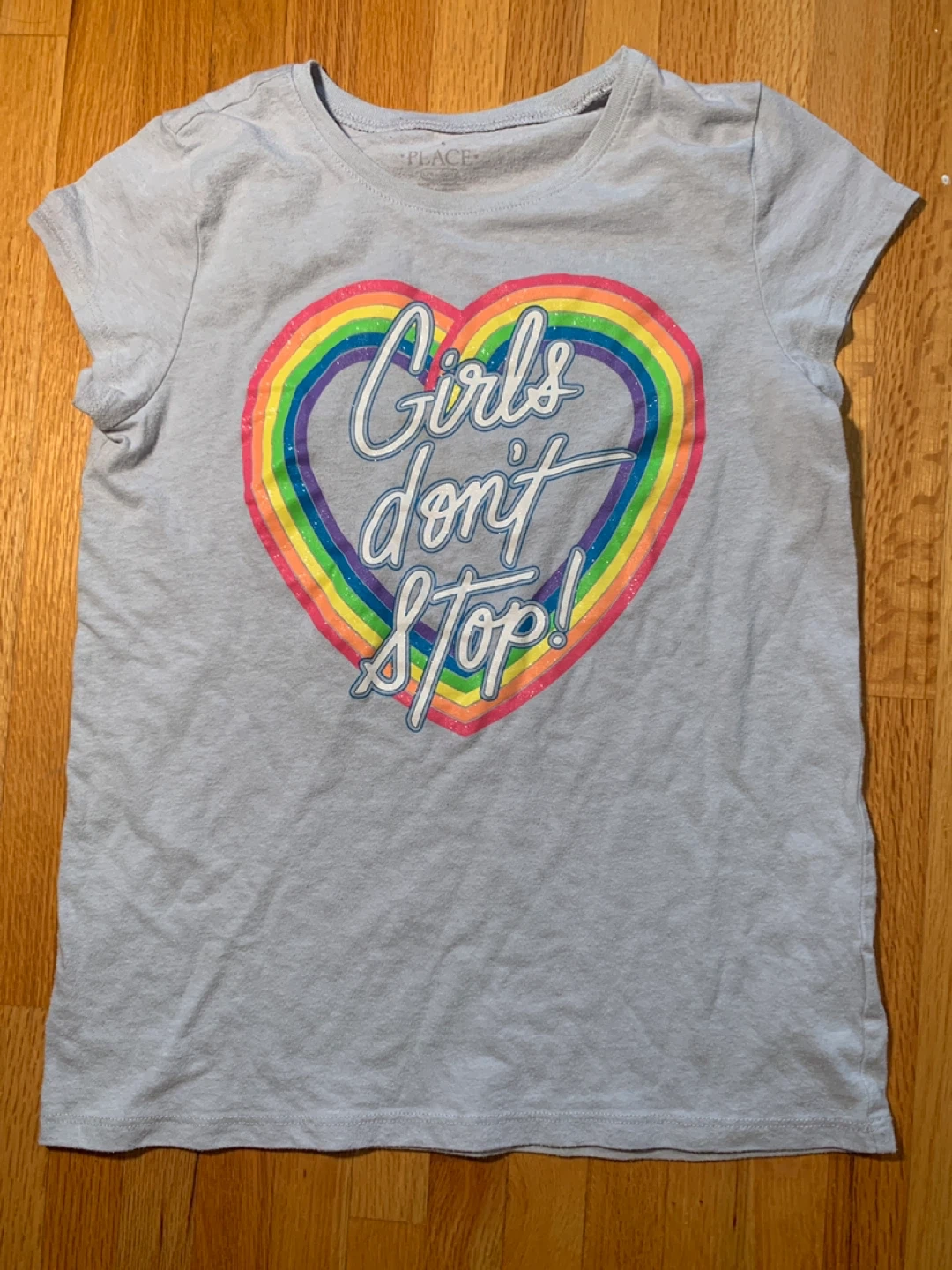This is a cute grey T-shirt from The Children's Place. It has a rainbow heart design with the words "Girls don't stop!" on the front. It's in great condition and perfect for a little girl aged 12-18 years