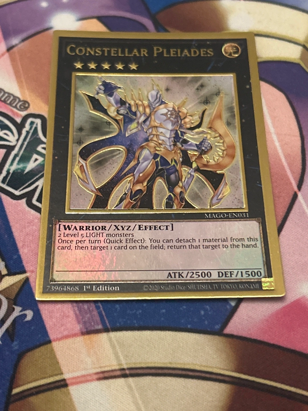Selling a Constellar Pleiades Yu-Gi-Oh! card. It's a Warrior/XYZ/Effect monster. It has an ATK of 2500 and a DEF of 1500. First Edition