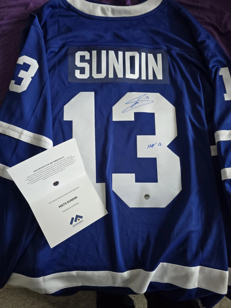 Selling a Toronto Maple Leafs jersey signed by Mats Sundin! It has the number 13 and Sundin's name on the back. Comes with a certificate of authenticity. Size XXXL. Tags still on.
