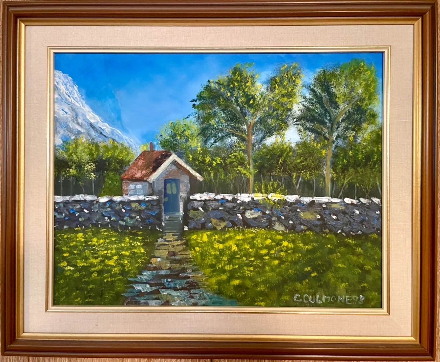 This framed impressionist style painting features a small, traditional cottage with a red roof and blue door. A stone wall in the foreground separates the cottage and a path from a grassy area with yellow flowers. Trees with green foliage stand behind the cottage and wall. A mountain or hill stands in the background on the left side. If it’s listed, no need to ask! IT’S AVAILABLE!! Asking $33 or best offer. Check out my other listings too!