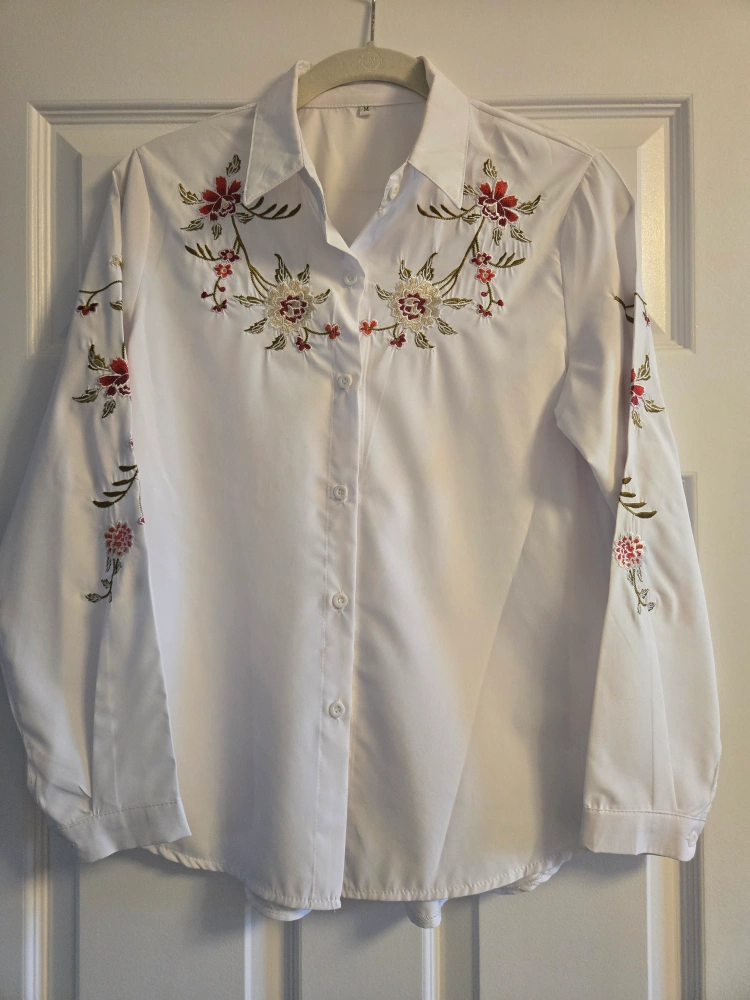 Selling a lovely white blouse with beautiful floral embroidery. It's a size medium and in great condition. Perfect for adding a touch of elegance to your wardrobe!
