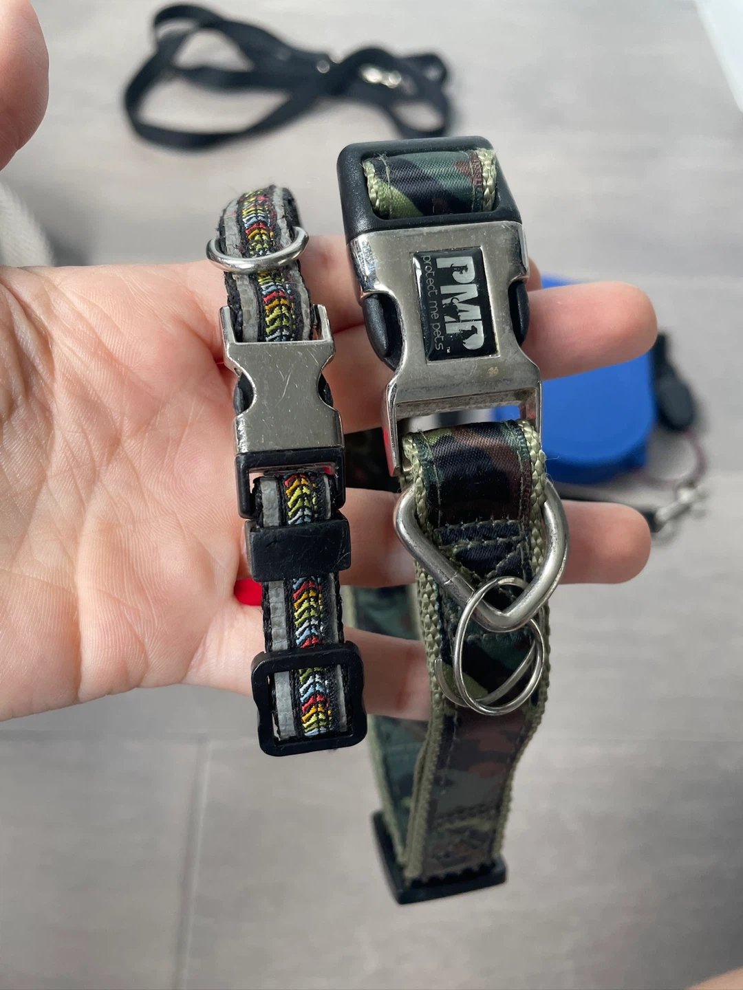 Two dog collars for sale! One is a PMP (Protect Me Pets) brand collar in a camouflage pattern, and the other is a smaller, colourful patterned collar. Both are in great condition and ready for your furry friends
