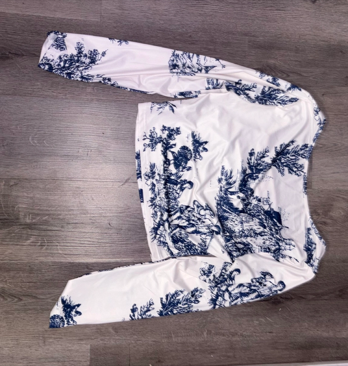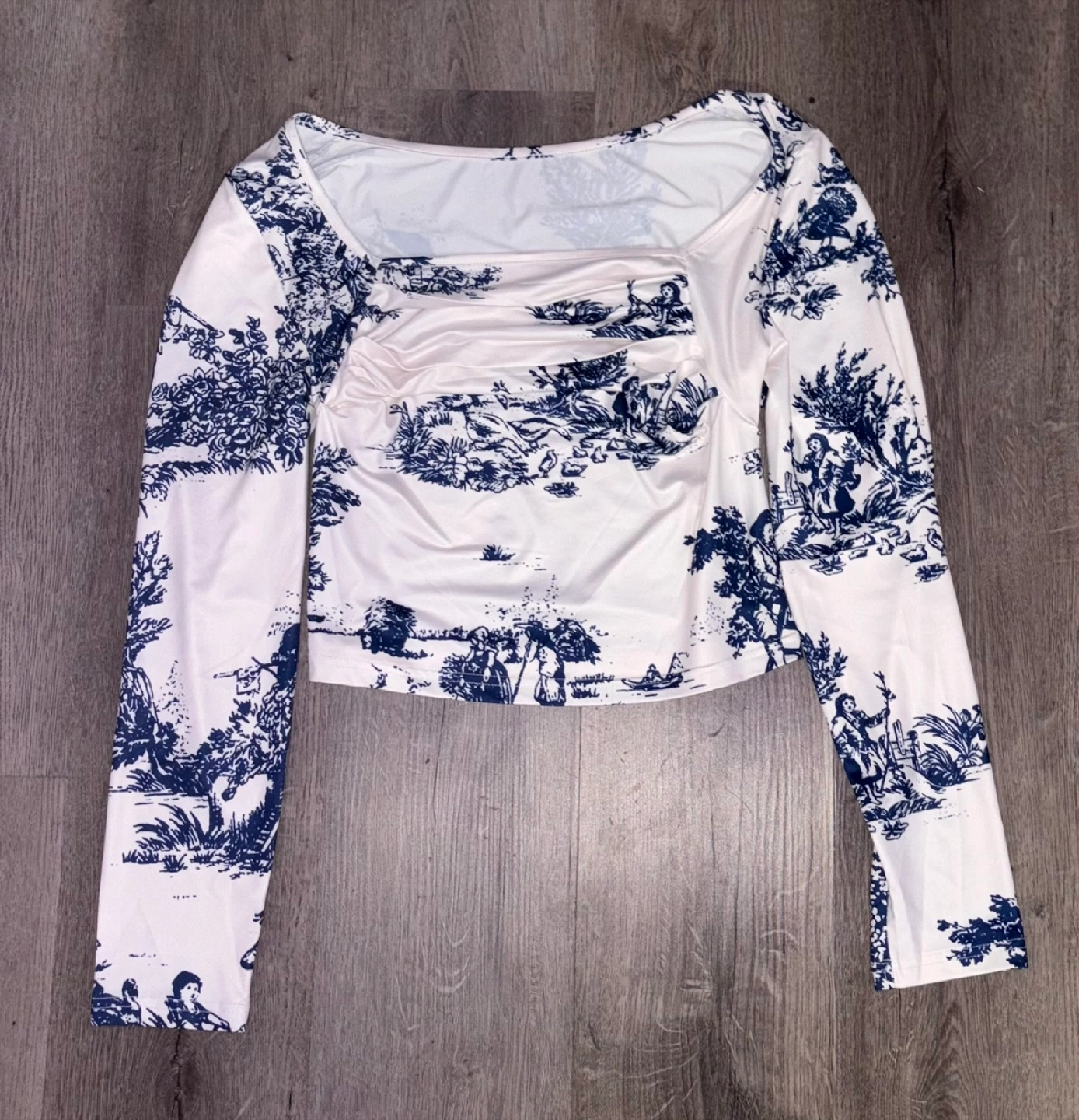 A lovely long-sleeve top with a unique blue and white pattern! It's in great condition and ready for a new home