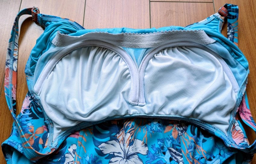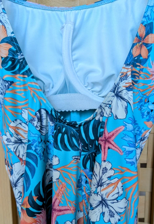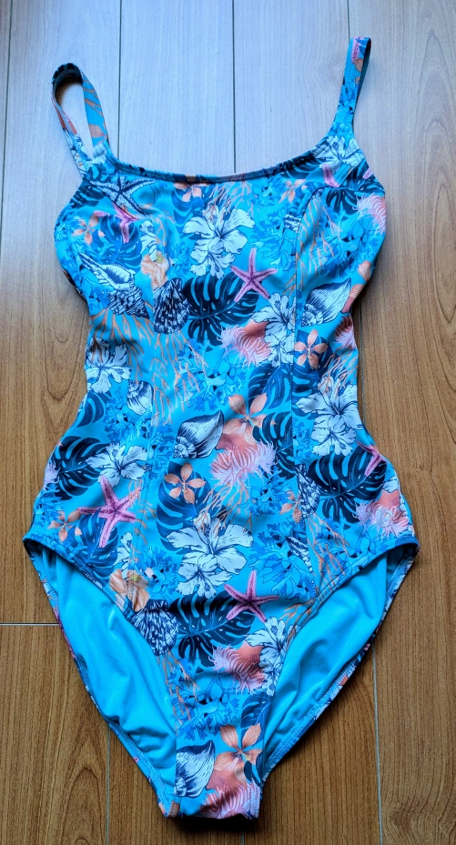 An amazing quality, cute floral swimsuit! It's a size 6 - 8, cup C . It has a beautiful pattern with tropical flowers, starfish, and seashells on a bright blue background. Perfect for the beach or pool!