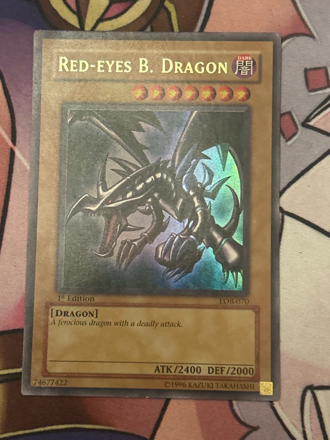 Selling a Red-Eyes B. Dragon Yu-Gi-Oh! card. It's a 1st Edition [DRAGON] with a ferocious dragon with a deadly attack. ATK/2400 DEF/2000. A great card for any collector!