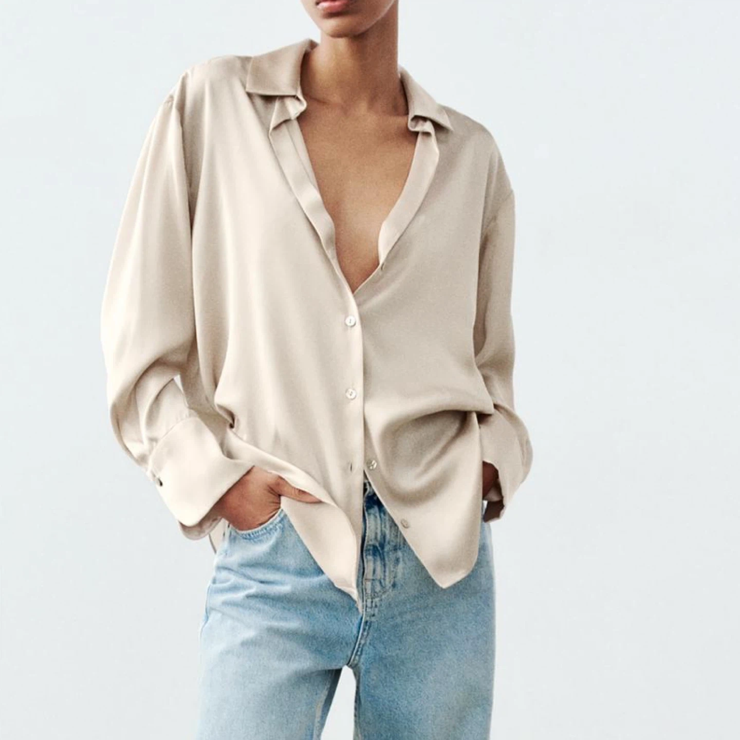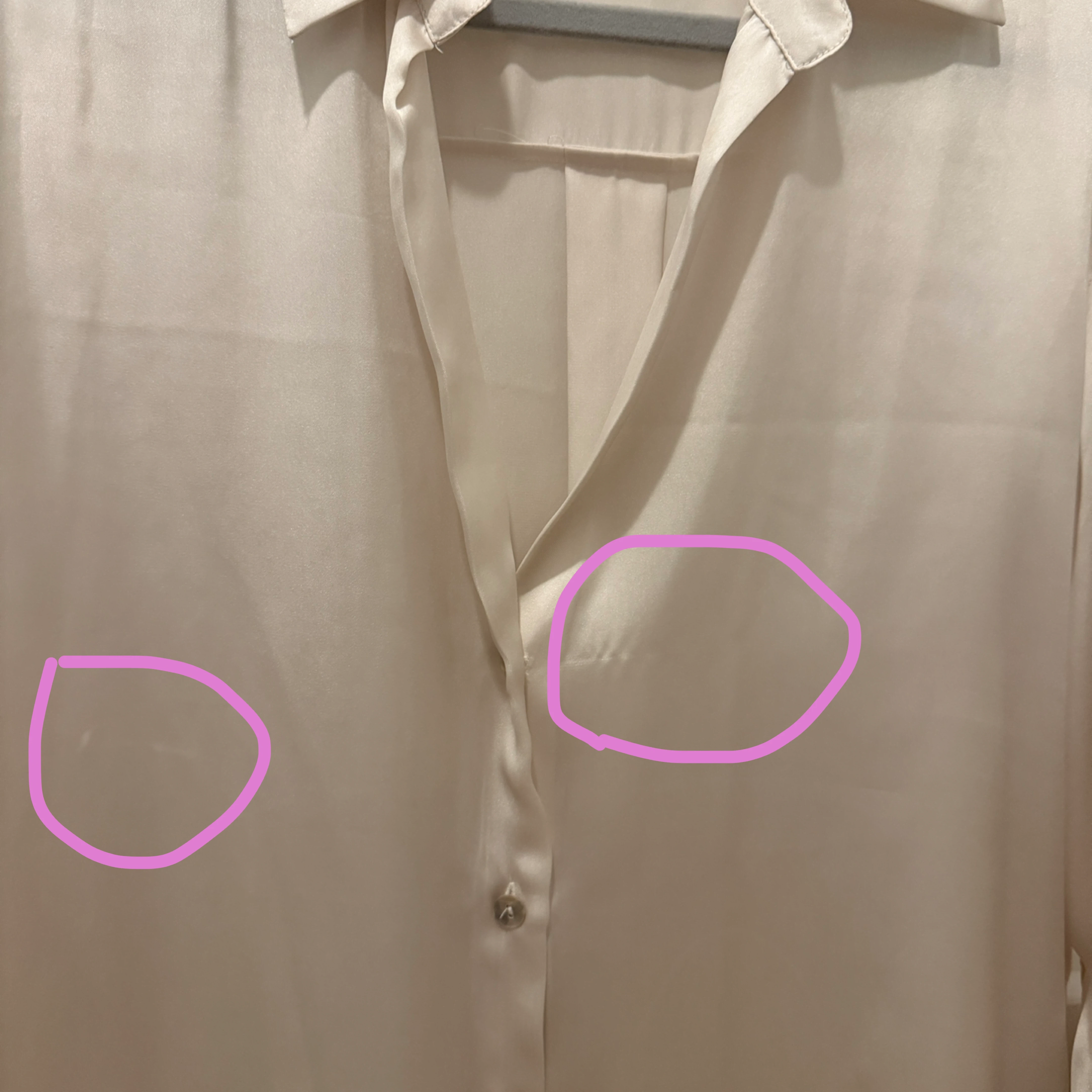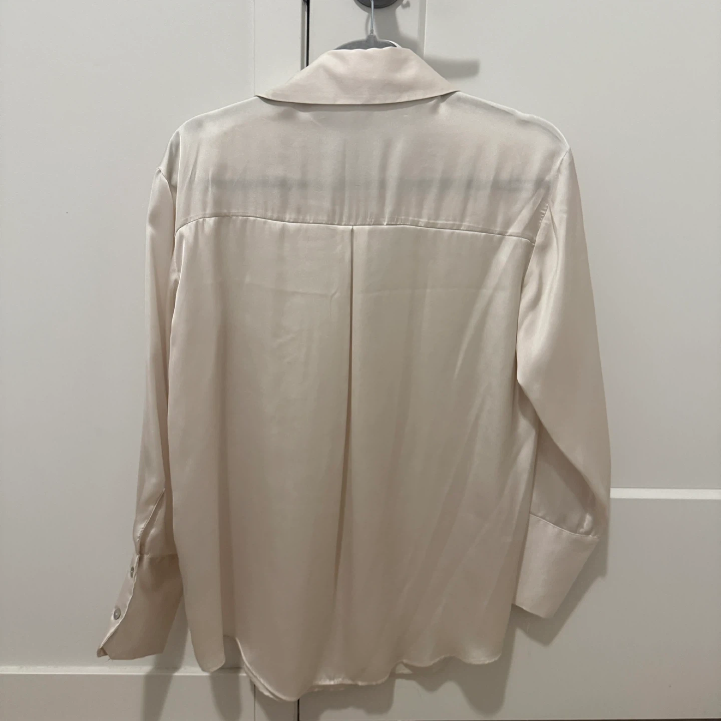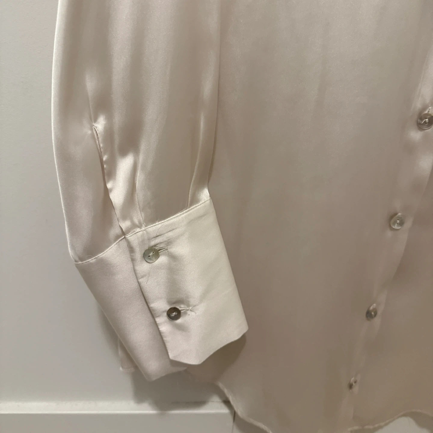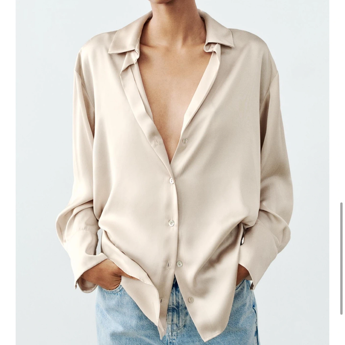 Zara satin effect shirt Small Oyster white Retail price was $40+tax Removed the tag but never worn Price reflects 2 small pulls (ordered online and it came like this) -- see photo #5