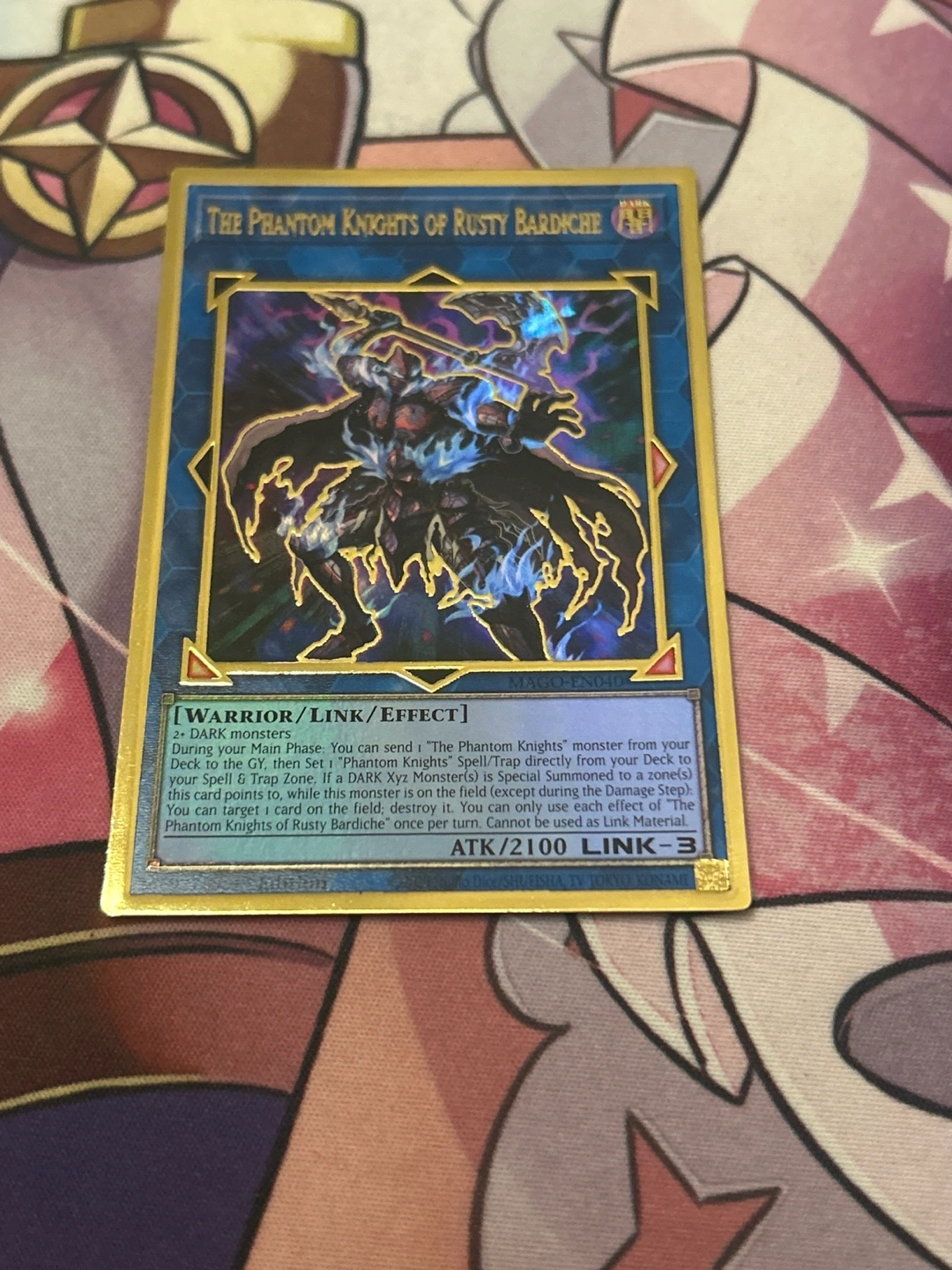 Selling The Phantom Knights of Rusty Bardiche card [WARRIOR/LINK/EFFECT] 2+ DARK monsters During your Main Phase: You can send 1 "The Phantom Knights" monster from your Deck to the GY, then Set 1 "Phantom Knights" Spell/Trap directly from your Deck to your Spell & Trap Zone If a DARK Xyz Monster(s) is Special Summoned to a zone(s) this card points to, while this monster is on the field (except during the Damage Step): You can target i card on the field; destroy it You can only use each effect of "The Phantom Knights of Rusty Bardiche" once per turn Cannot be used as Link Material ATK/2100 LINK-3