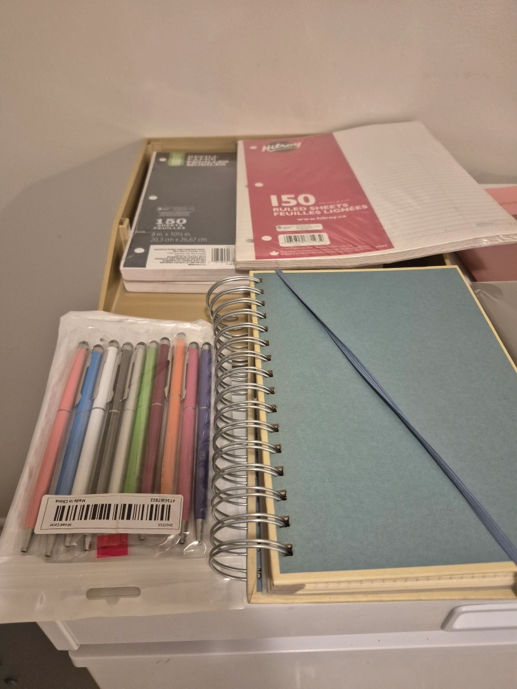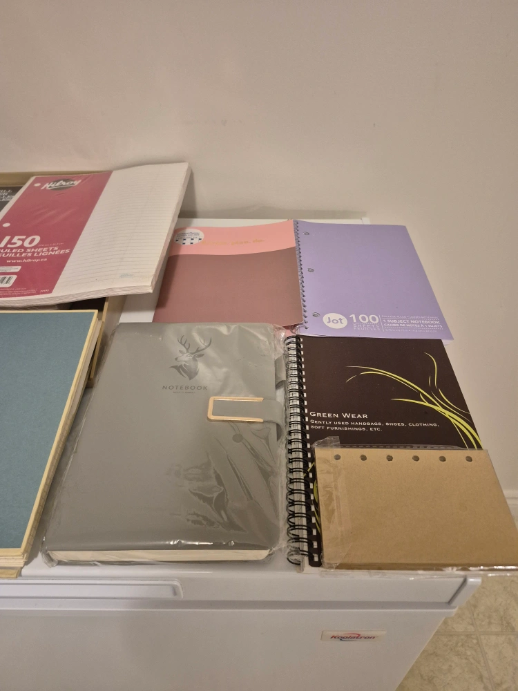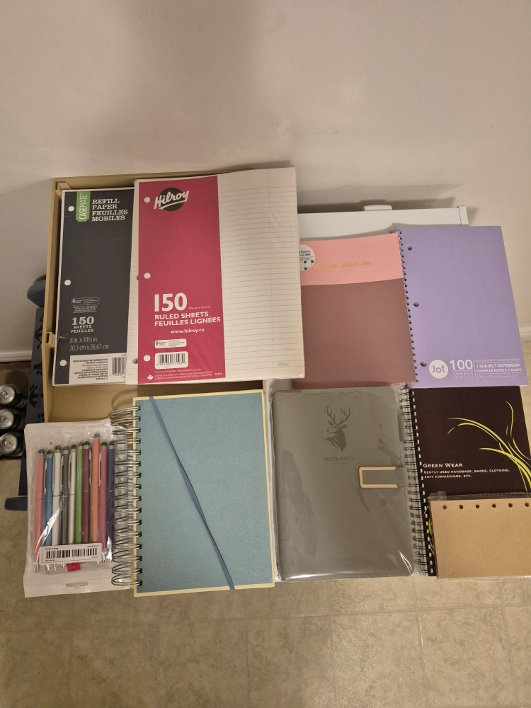 Selling a bundle of notebooks and Hilroy refill paper. Includes various sizes and styles of notebooks, and a package of Hilroy 150 ruled sheets and two other packages of 150 ruled sheet note paper!! Perfect for students or anyone who loves to write!! Pens of various colours and a beige paper tray also included! Get yourself or your child school supplies for this year's School Year!!! Curbside pickup M-Sat 5pm-10pm. Or Delivery within London for an extra $5!!