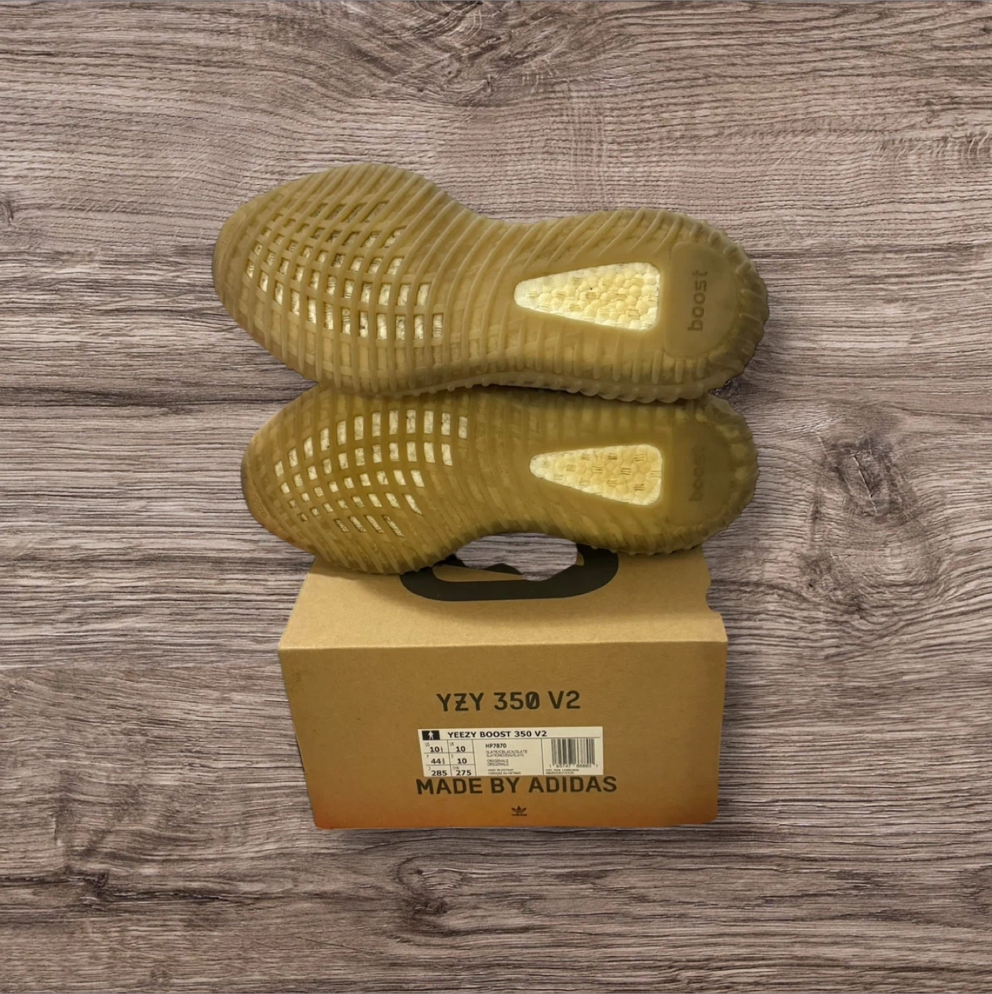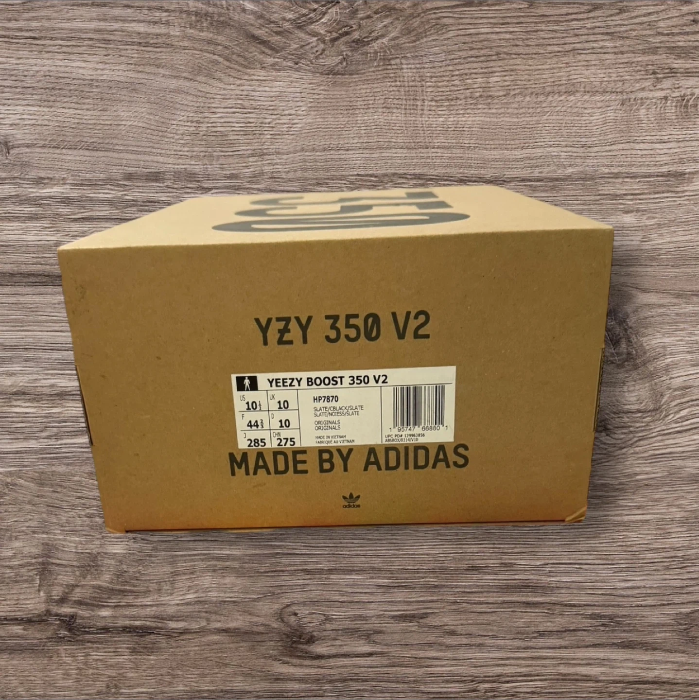 Selling a pair of Adidas Yeezy Boost 350 V2 in the Slate colourway, size 10.5 US. These stylish sneakers come with the original box. The model number is HP7870.