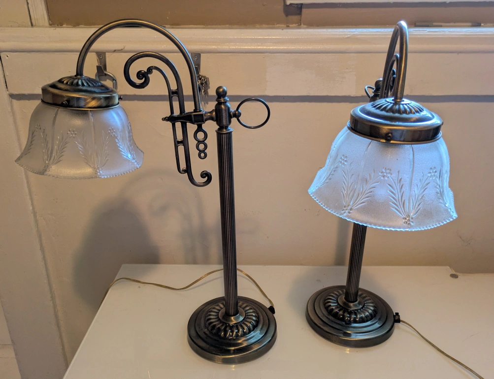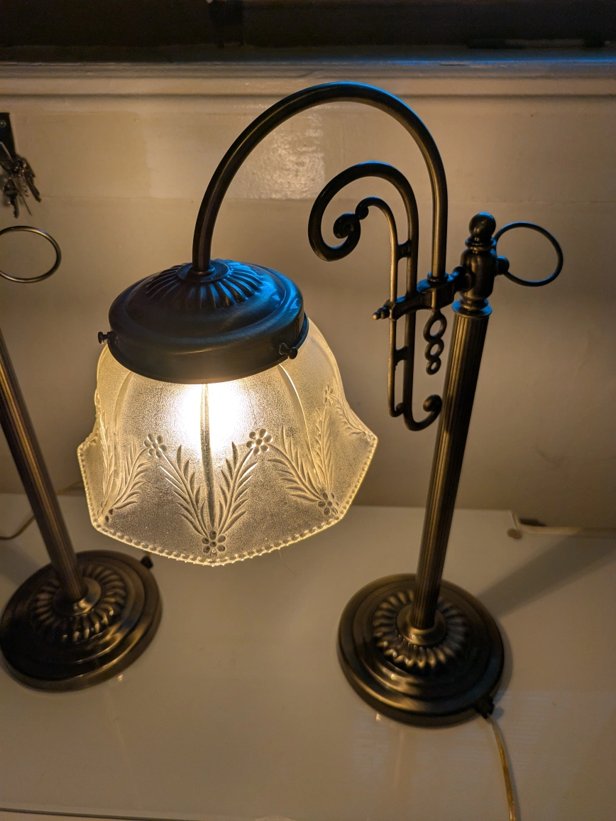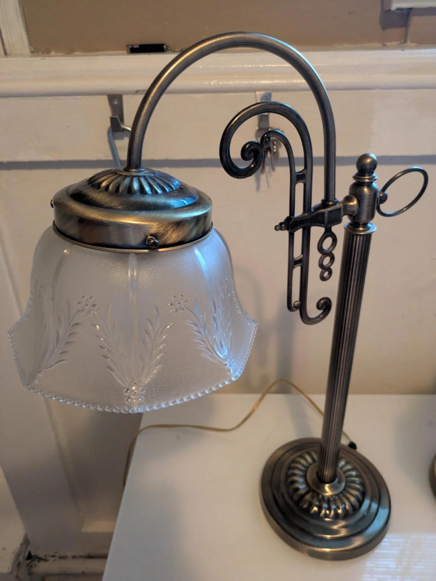 Selling a set of two antique-style table lamps. They feature a beautiful frosted glass shade with a floral pattern and a metal base with an antique brass finish. These lamps would add a touch of vintage charm to any room! Measures 23" inch tall 15 inch wide Pick up in the West End of Vancouver