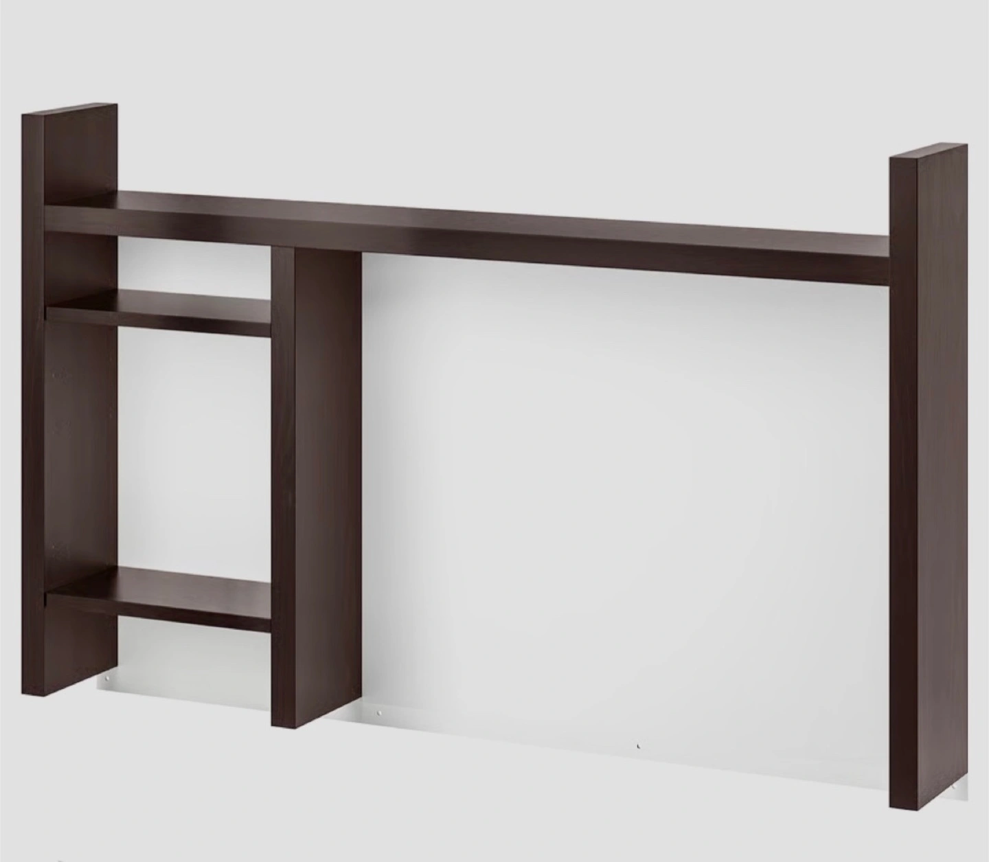 Selling an IKEA wall shelf in brown-black. It's in excellent condition and ready for a new home! Here are the approximate dimensions: - Width: 104 cm (41") - Depth: 16 cm (6 1/4") - Height: 65 cm (25 5/8") It's a sturdy piece, weighing about 10 kg (22 lbs). Perfect for adding some storage to your work/study space