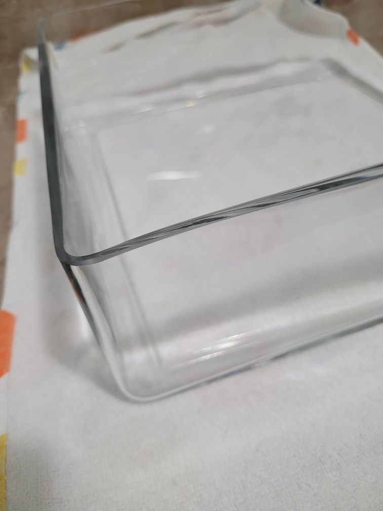12"x12"x4" clear glass container that was acquired through a florist. It had the green foam in it and a fresh flower arrangement. It has been used for display purposes for many items since then. ****** This is not a kitchen/baking item. I have no idea if this is safe for oven use.