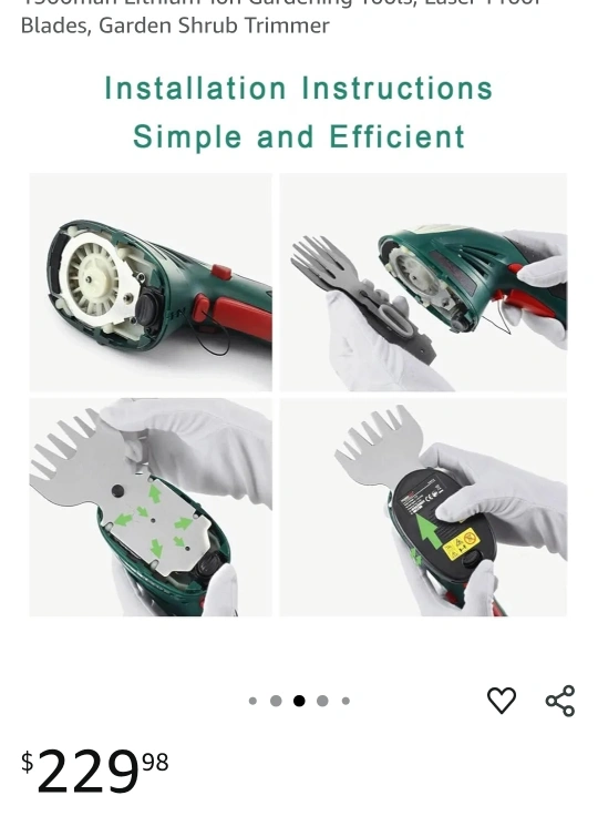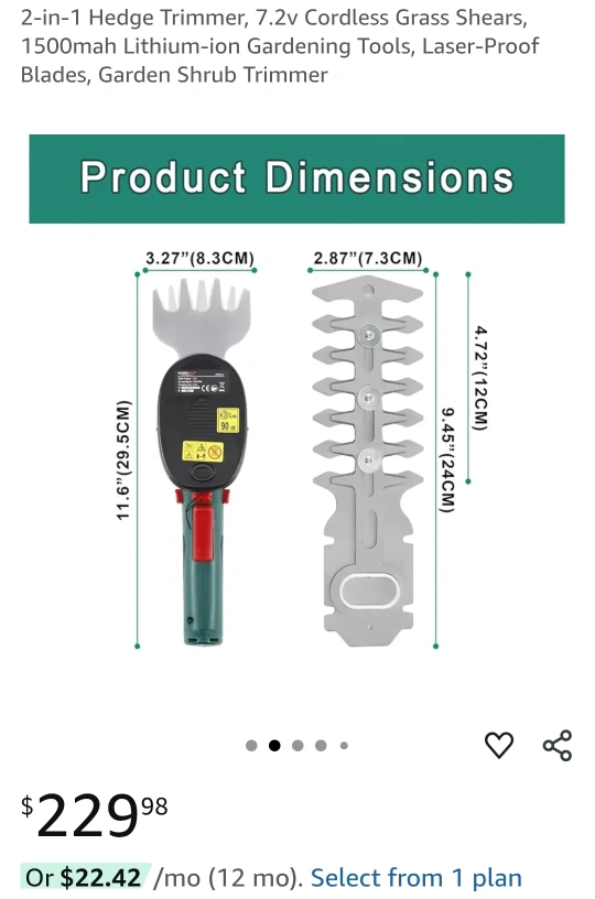 Selling a 2-in-1 cordless grass shear and hedge trimmer. It features a 7.2V cordless grass shear and a 1500mAh lithium-ion battery. The trimmer has laser-proof blades and is suitable for garden shrub trimming. The product dimensions are: - 3.27" (8.3cm) width - 2.87" (7.3cm) length - 11.6" (29.5cm) height - 4.72" (12cm) blade length - 9.45" (24cm) total length The grass shear has a max width of 83mm, and the hedge trimmer has a max cutting length of 120mm. item similar to the one I have is going for around $200 . I'm asking $40