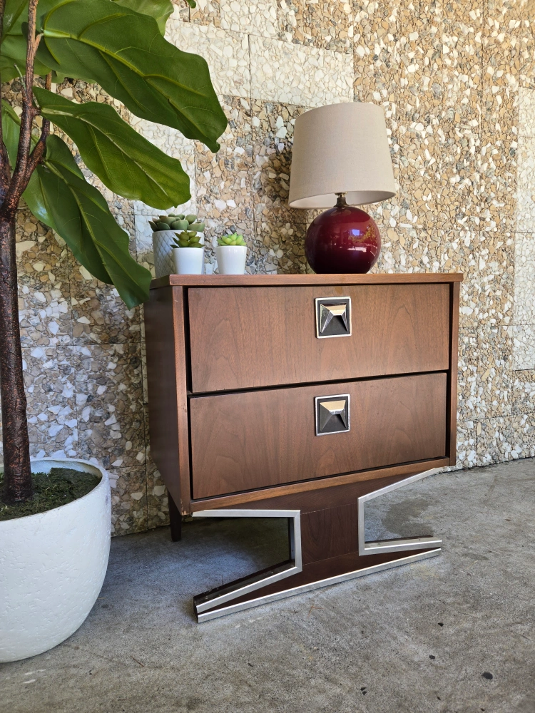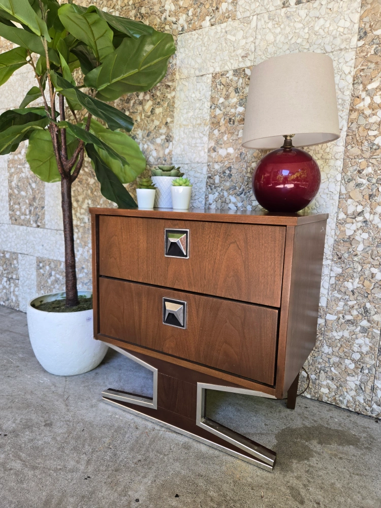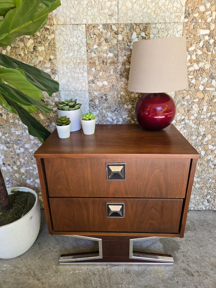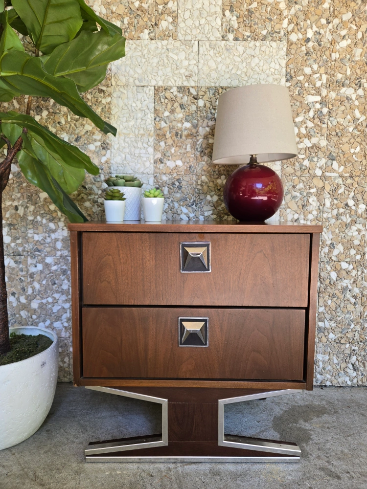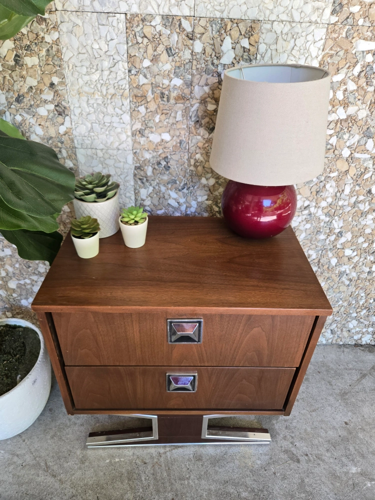 Art Deco Single Walnut Nightstand With Chrome Accents (Delivery Available) Here's a cool mid-century modern Armoire dresser and nightstand set! The set has a beautiful walnut veneer finish and unique chrome details. It would be a great addition to any bedroom or living space looking for a vintage touch. Nightstand available for $240 or take both for $850 Dimensions: Armoire- 34w x 18.25d x 45.5h Nightstand- 23.25w x 14d x 24h Pick up in downtown Vancouver or delivery may be arranged for a reasonable fee. Priority is given to those who are able to pick up. Tags: retro vintage antique burl wood rosewood walnut brass gold copper 1920s 1930s 1940s sideboard credenza buffet server Hutch cabinet tv bench hallway table console table entertainment unit living room dining room mcm mid century modern furniture retro vintage vinyl teak 1950s 1960s 1970s sixties tall boy tallboy cb2 eq3 west elm rental staging film tv Bedroom chest of drawers dresser rental